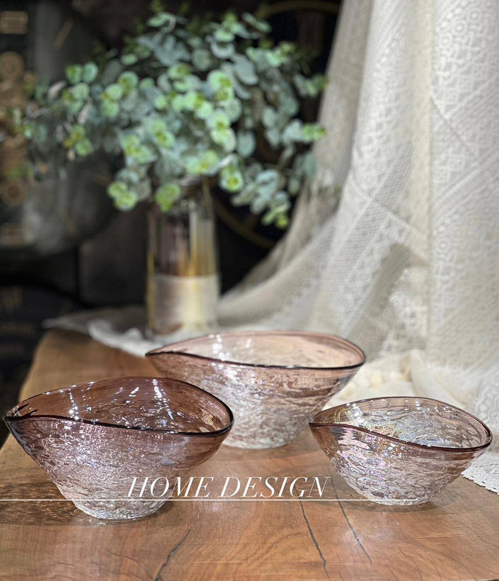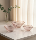 این تصویر ست سهتایی کاسههای شیشهای صورتی‑بنفش ملایم رو نشون میده