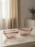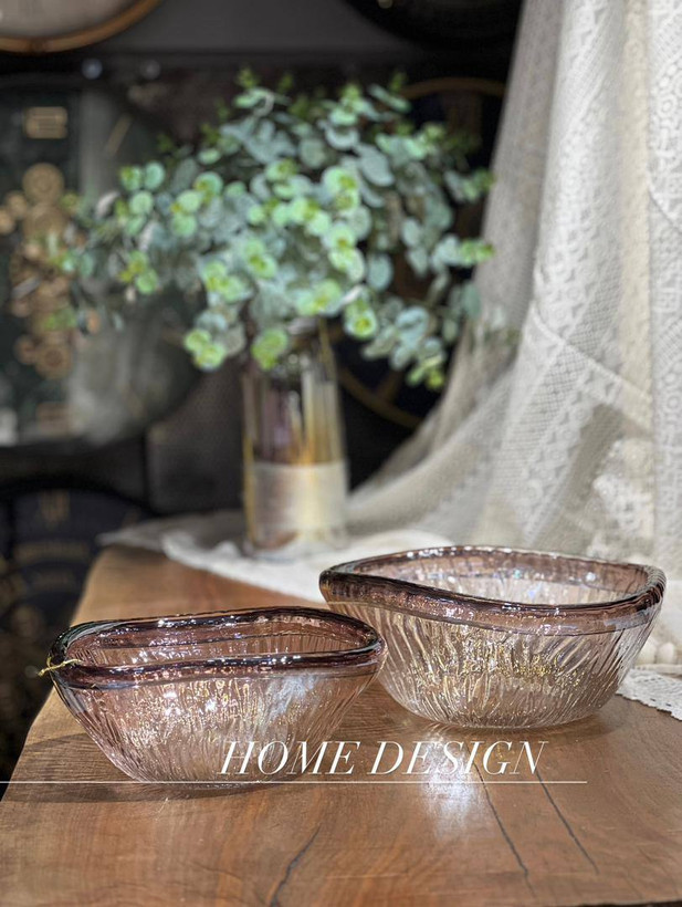 دو کاسه با فرم آزاد و لبههای نامتقارن موجدار روی میز مرمری روشن قرار دارند. جنس آنها شیشهی ضخیم شفاف است با رگهها و بافت عمودی که زیر نور طبیعی جلوهای کریستالی و ظریف ایجاد میکند. رنگ صورتی‑بنفش لطیف، حس گرما و آرامش را بدون درخشش زیاد منتقل میکند.