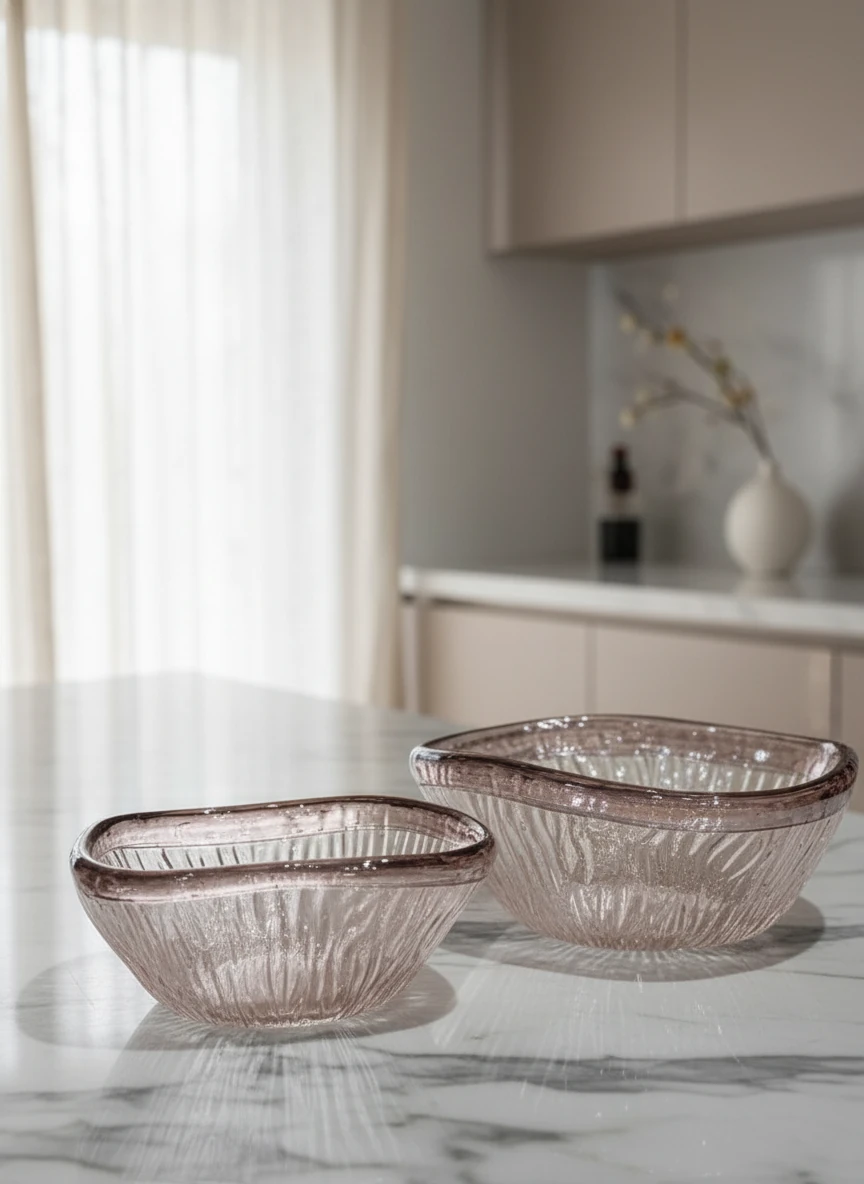دو کاسه با فرم آزاد و لبههای نامتقارن موجدار روی میز مرمری روشن قرار دارند. جنس آنها شیشهی ضخیم شفاف است با رگهها و بافت عمودی که زیر نور طبیعی جلوهای کریستالی و ظریف ایجاد میکند. رنگ صورتی‑بنفش لطیف، حس گرما و آرامش را بدون درخشش زیاد منتقل میکند.