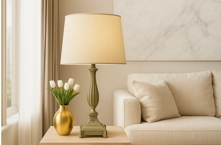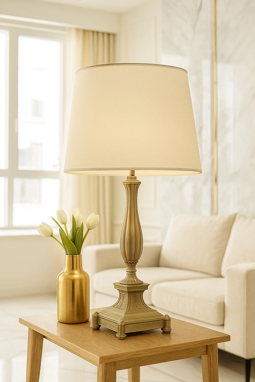 اباژور رومیزی کلاسیک مدرن را نشان میدهد که بهزیبایی در فضایی روشن و آرام قرار گرفته است. پایهی لامپ از جنس فلز با پوشش برنزی مات ساخته شده و طراحی آن الهامگرفته از سبک نئوکلاسیک اروپایی است. شِید (کلاهک لامپ) از پارچه کرم رنگ با بافت نرم تهیه شده که نور را با گرمایی ملایم پخش میکند و باعث ایجاد حس آرامش و لوکس بودن در محیط میشود