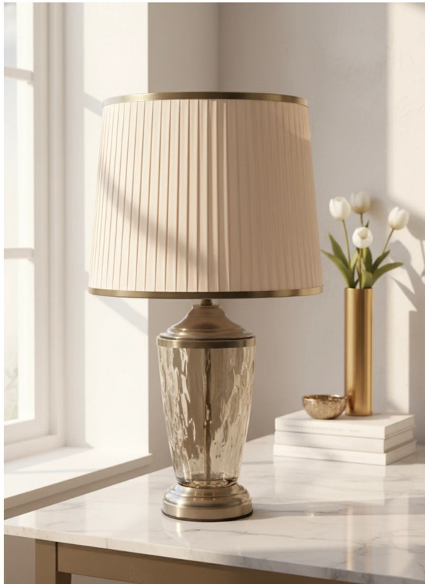این تصویر یک لامپ رومیزی لوکس کلاسیک را نشان میدهد. پایهی آن از شیشهی طرحدار با پوشش طلایی و برنز مات ساخته شده و بخش بالایی دارای فلز آبکاریشده گرم است. کلاهک (شِید) به رنگ کرم روشن با چینهای عمودی ظریف طراحی شده و لبههای طلایی آن هماهنگی کاملی با پایه دارد. نور عبوری از شید، گرم، نرم و یکنواخت است و فضایی آرام و اشرافی ایجاد میکند.