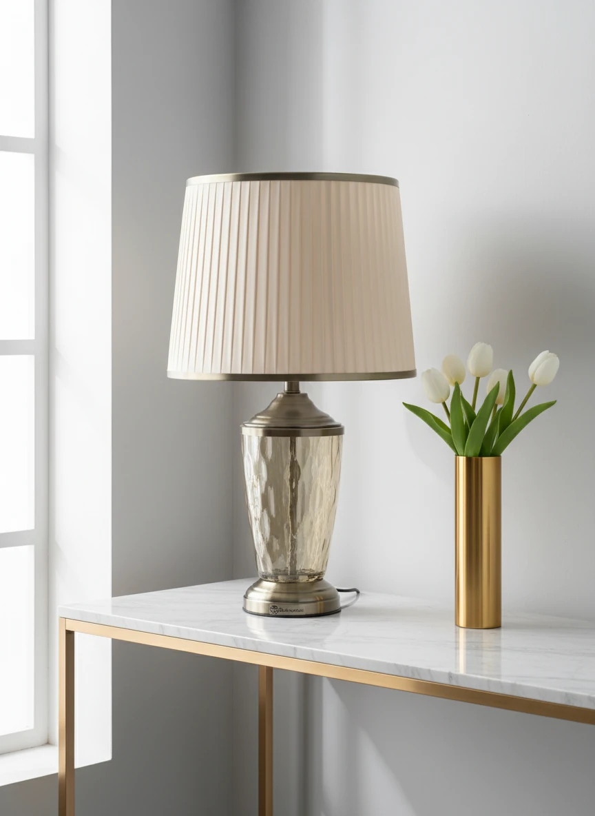 این تصویر یک لامپ رومیزی لوکس کلاسیک را نشان میدهد. پایهی آن از شیشهی طرحدار با پوشش طلایی و برنز مات ساخته شده و بخش بالایی دارای فلز آبکاریشده گرم است. کلاهک (شِید) به رنگ کرم روشن با چینهای عمودی ظریف طراحی شده و لبههای طلایی آن هماهنگی کاملی با پایه دارد. نور عبوری از شید، گرم، نرم و یکنواخت است و فضایی آرام و اشرافی ایجاد میکند.