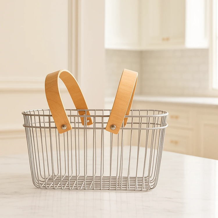 این سبد فلزی زیبا با طراحی مدرن و دستههای چوبی طبیعی، ترکیبی از سادگی و ظرافت را در خود دارد. ظاهرش در سبک Snow Classic Modern کاملاً مینیمال، تمیز و کاربردی است؛ مناسب برای چیدمان آشپزخانه، نگهداری میوه یا نان، و حتی تزئین روی کانتر یا میز سرو.