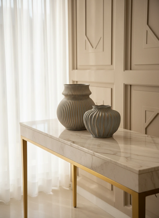در تصویر دو گلدان سرامیکی شیاردار با فرم کلاسیک و رنگ خنثی دیده میشوند که کاملاً در سبک Snow Classic Modern قرار دارند — ترکیبی از ظرافت مینیمال و حس لوکس طبیعی.