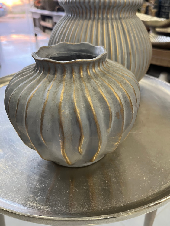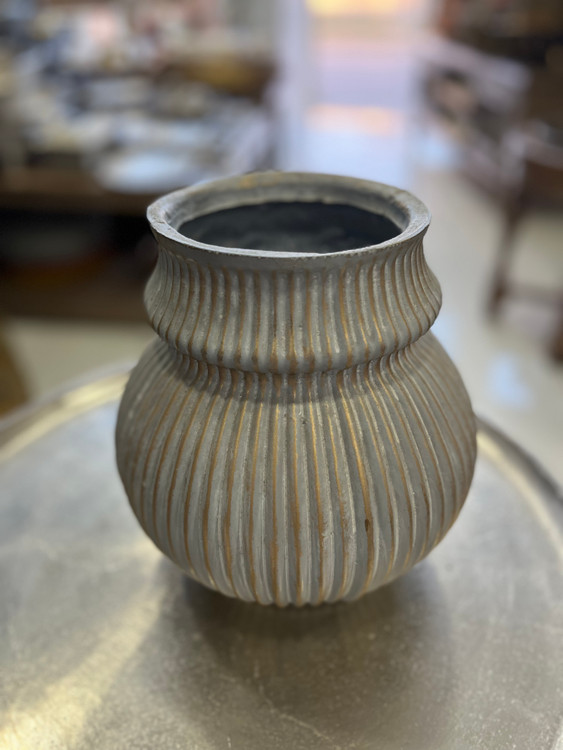 فرم کروی کشیده با دهانه کمی باریک و شیارهای عمودی یکنواخت دارد.