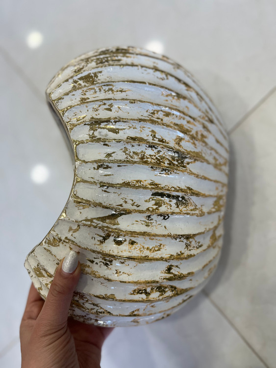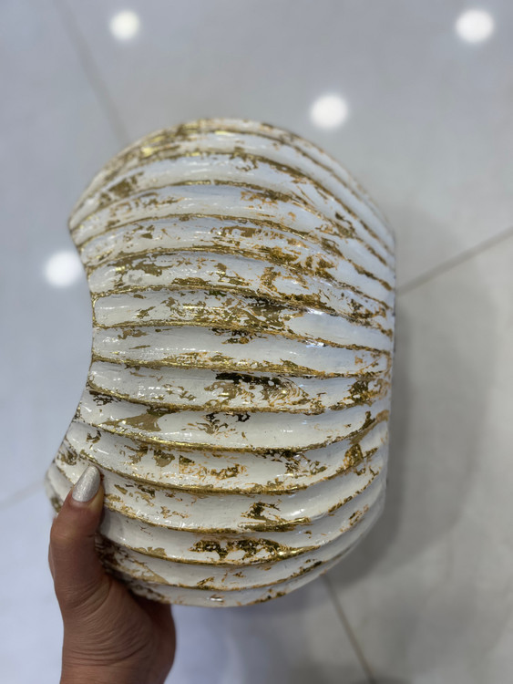 ویژگی توضیح کامل فرم کلی صدفی گرد با شیارهای عمودی نرم و منظم؛ دهانه باریک و منحنی آرام در بالا.