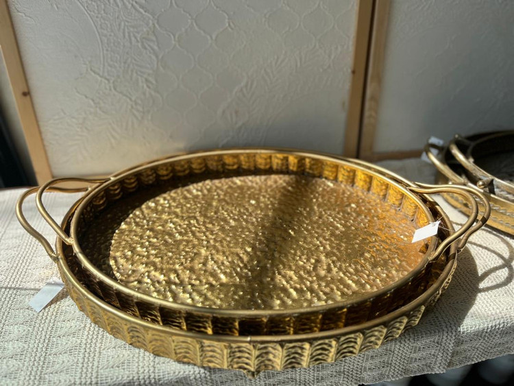 سینیهای مراکشی معمولاً دستساز و از فلز برنج یا آلیاژ طلایی ساخته میشن و سطحشون طرح چکشخورده یا قلمزنی ظریف هندسی داره که نور رو بهصورت نرم و پراکنده بازتاب میده. در این ست خاص: