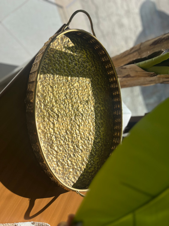 این سینی مراکشی در سبک فضا را از حالت کاملاً مدرن سرد خارج میکند و با بازتاب طلایی گرم، حس صمیمیت، هنر دستی و لوکس طبیعی ایجاد میکند — بهویژه وقتی روی سنگ مرمر کرم روشن با شمع یا لیموهای زرد پراکنده قرار گیرد، تداعیکنندهی ترکیب آفتاب مراکش و آرامش مدیترانهای است