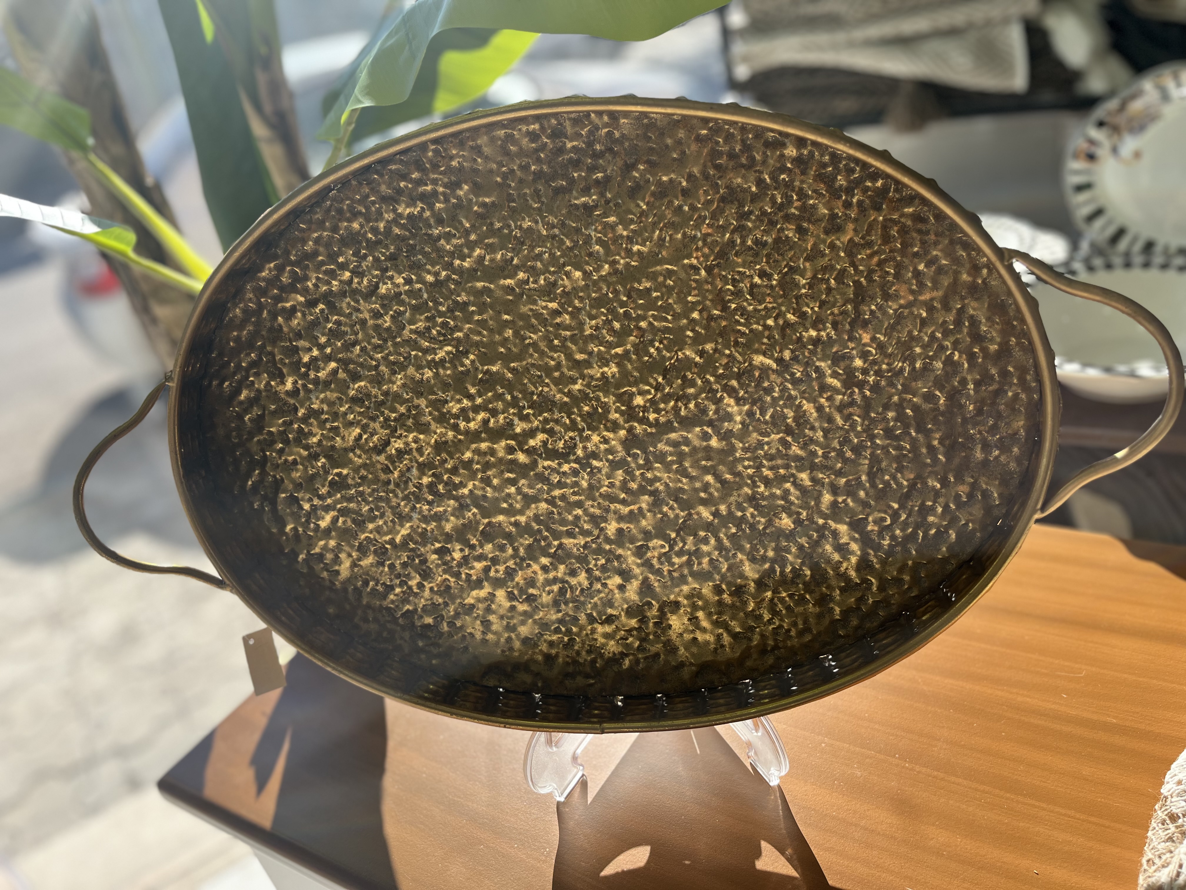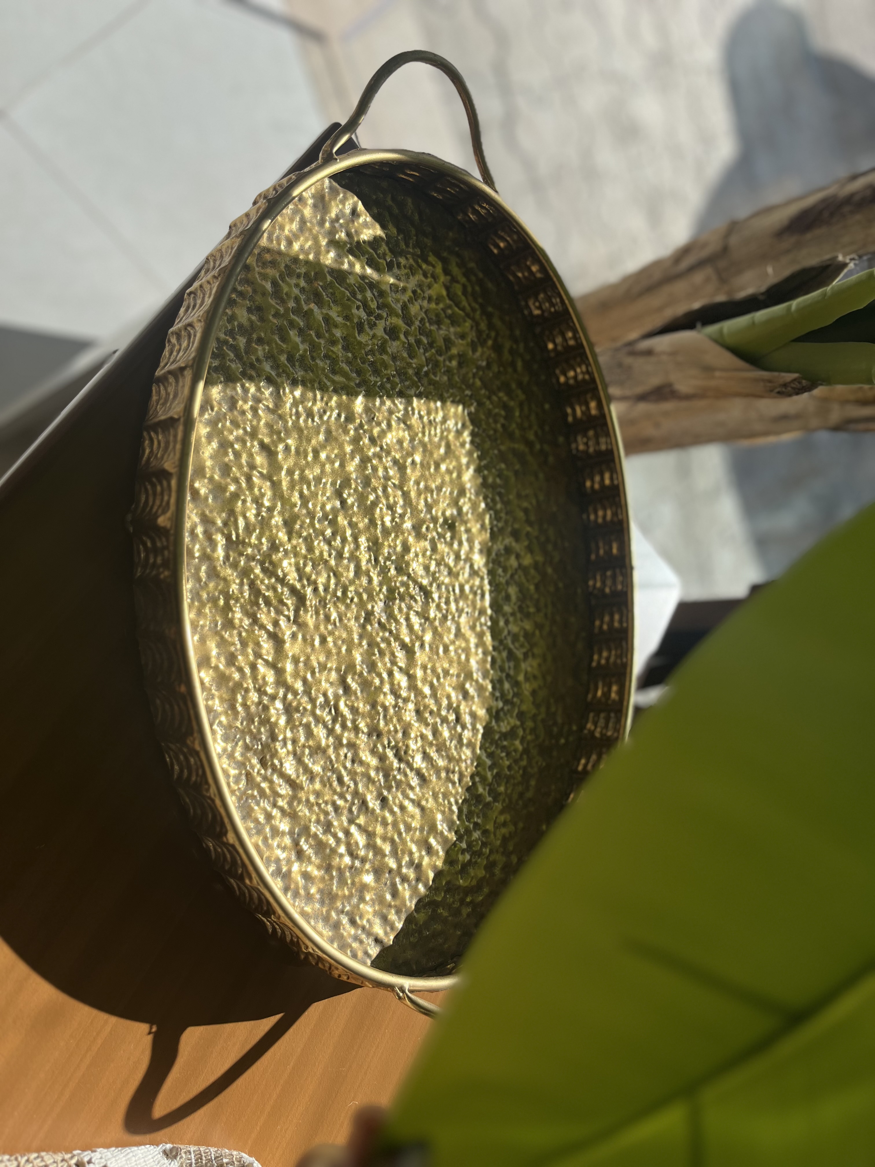 سینیهای مراکشی معمولاً دستساز و از فلز برنج یا آلیاژ طلایی ساخته میشن و سطحشون طرح چکشخورده یا قلمزنی ظریف هندسی داره که نور رو بهصورت نرم و پراکنده بازتاب میده. در این ست خاص: