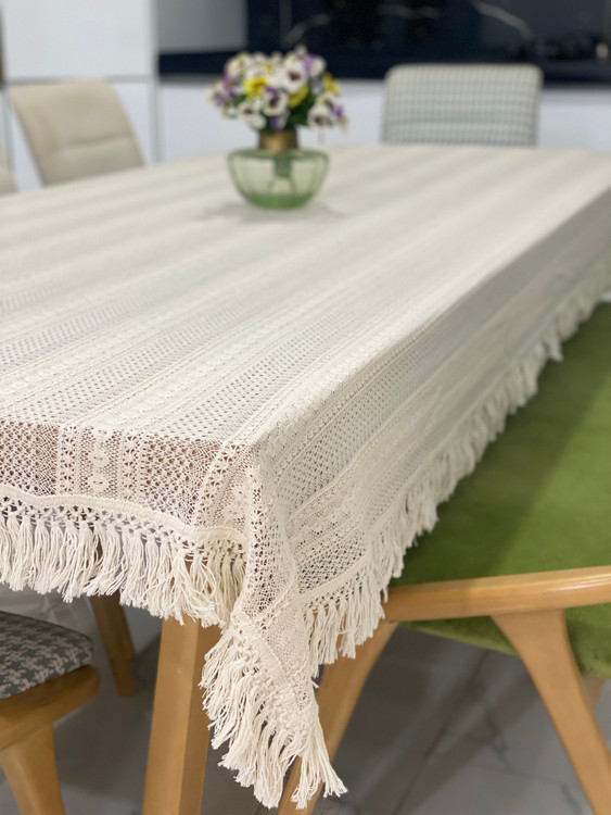 رومیزی در تصویر از جنس گیپور دستبافت سبک بوهو‑نچرال است. طرح بافت بهصورت نوارهای افقی هندسی و گلدار ظریف در هم تنیده شده، که جلوهای یکدست، نرم و ایستاده روی میز ایجاد میکند.
