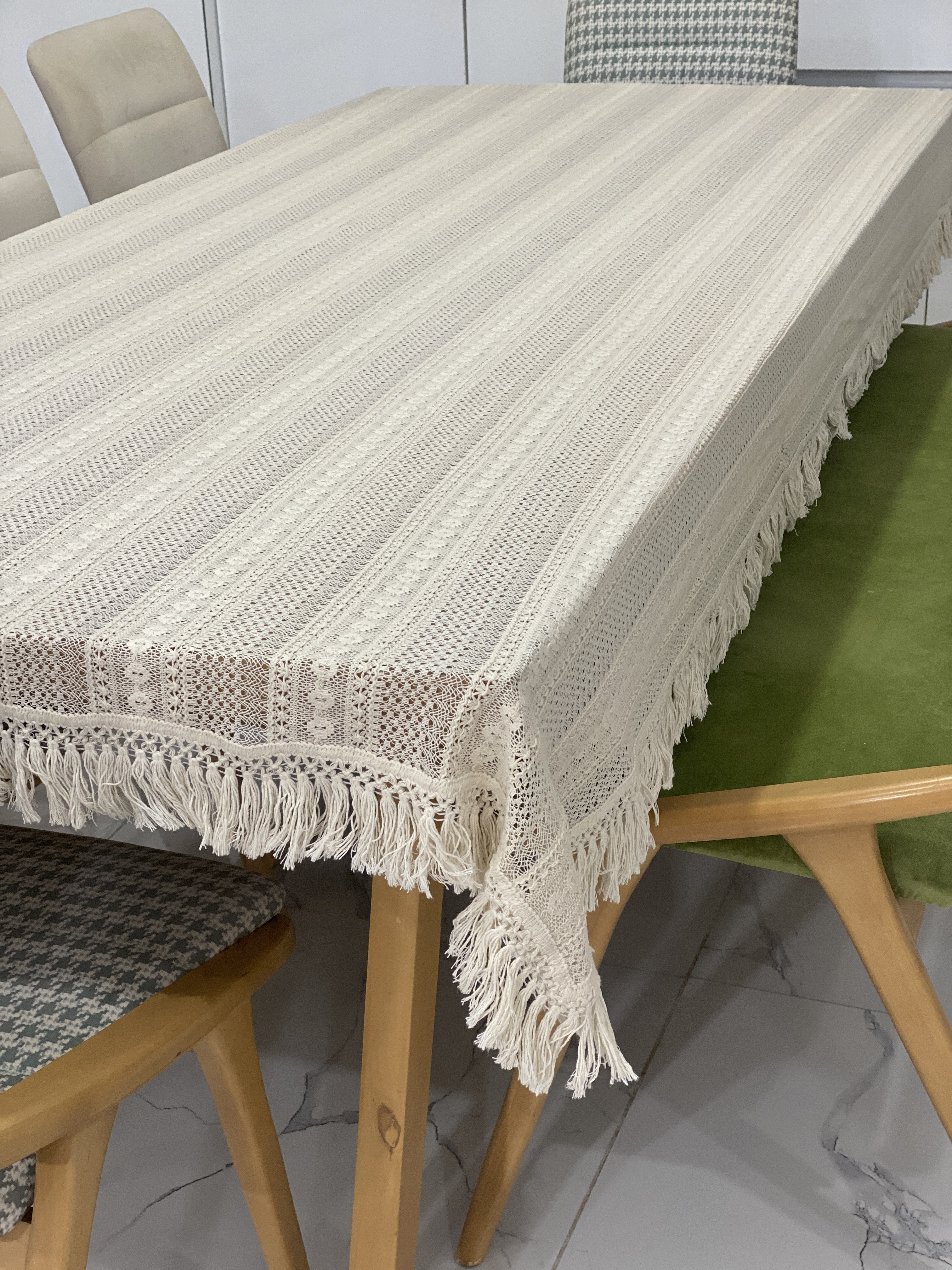 رومیزی در تصویر از جنس گیپور دستبافت سبک بوهو‑نچرال است. طرح بافت بهصورت نوارهای افقی هندسی و گلدار ظریف در هم تنیده شده، که جلوهای یکدست، نرم و ایستاده روی میز ایجاد میکند.
