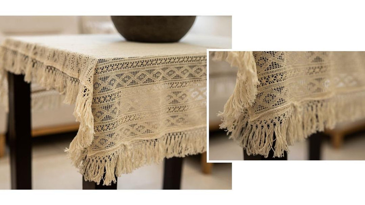 این رومیزی، نمونهای بسیار ظریف از سبک Organic-Boho است که با بافت گیپوری پنبهای دستبافت طراحی شده. رنگ آن کرم طبیعتی (Natural beige) است و منگولههای بلند تابیده و نرم در لبهها دارد که حالت گرم و دنج به فضا میدهد.