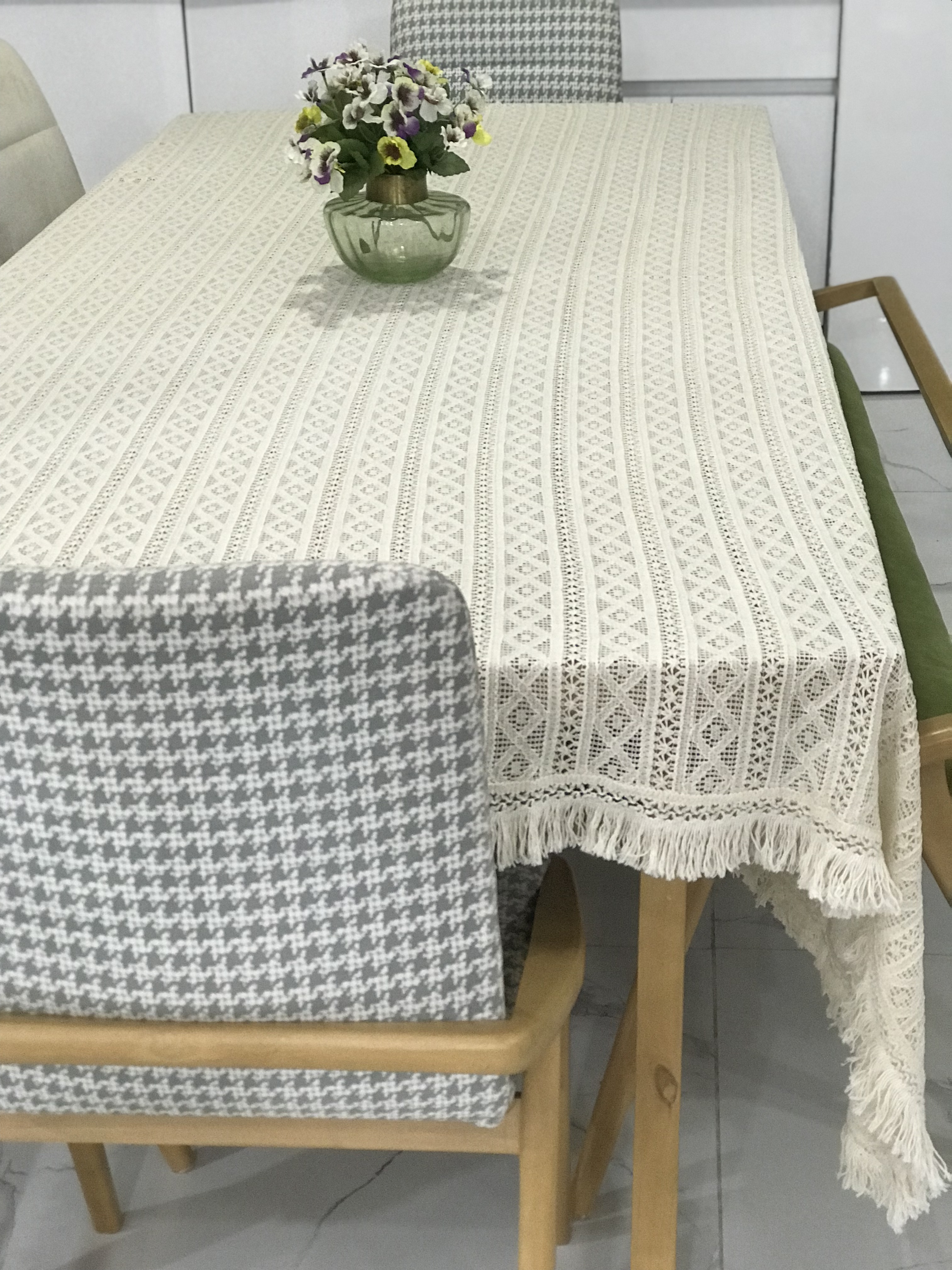این رومیزی، نمونهای بسیار ظریف از سبک Organic-Boho است که با بافت گیپوری پنبهای دستبافت طراحی شده. رنگ آن کرم طبیعتی (Natural beige) است و منگولههای بلند تابیده و نرم در لبهها دارد که حالت گرم و دنج به فضا میدهد.
