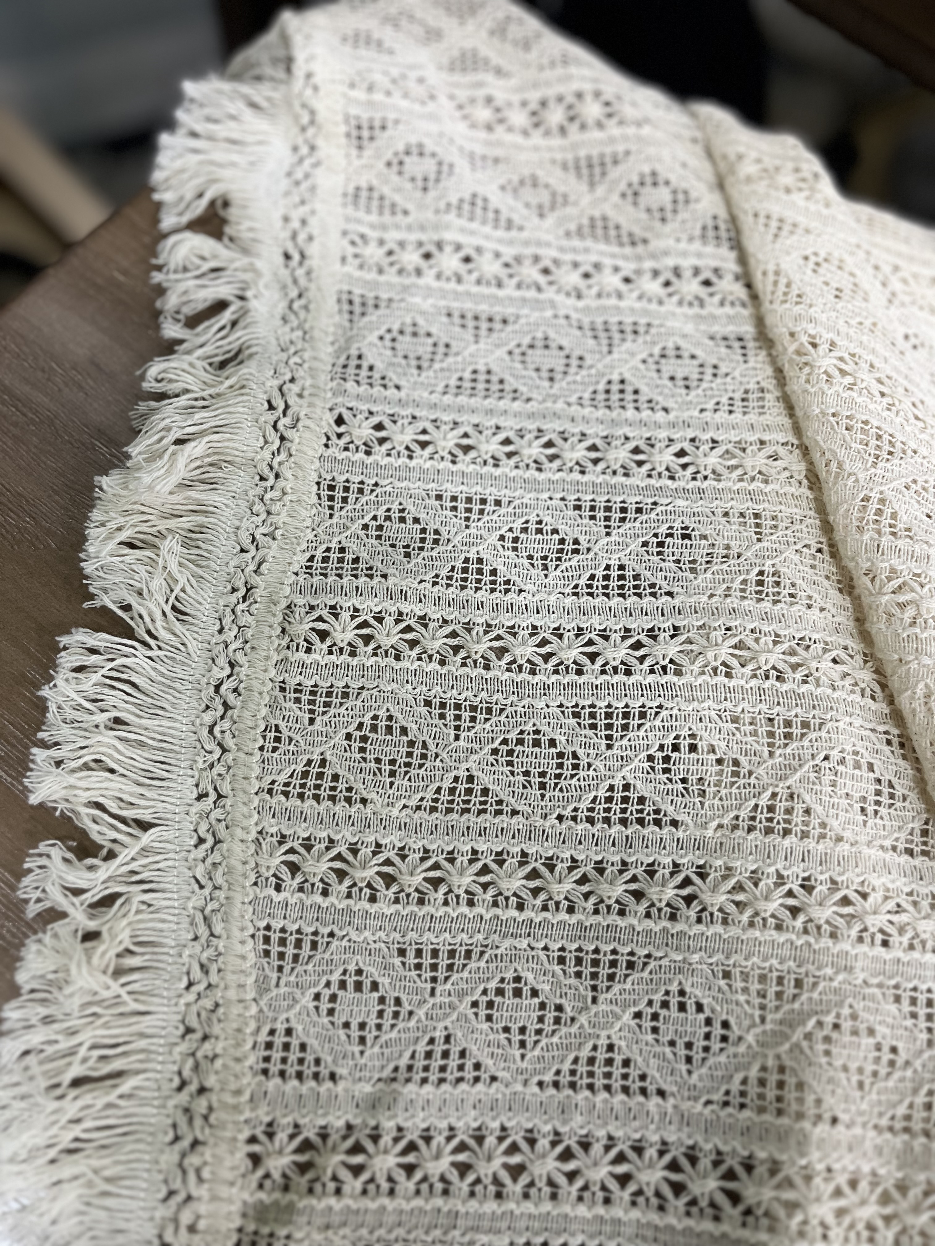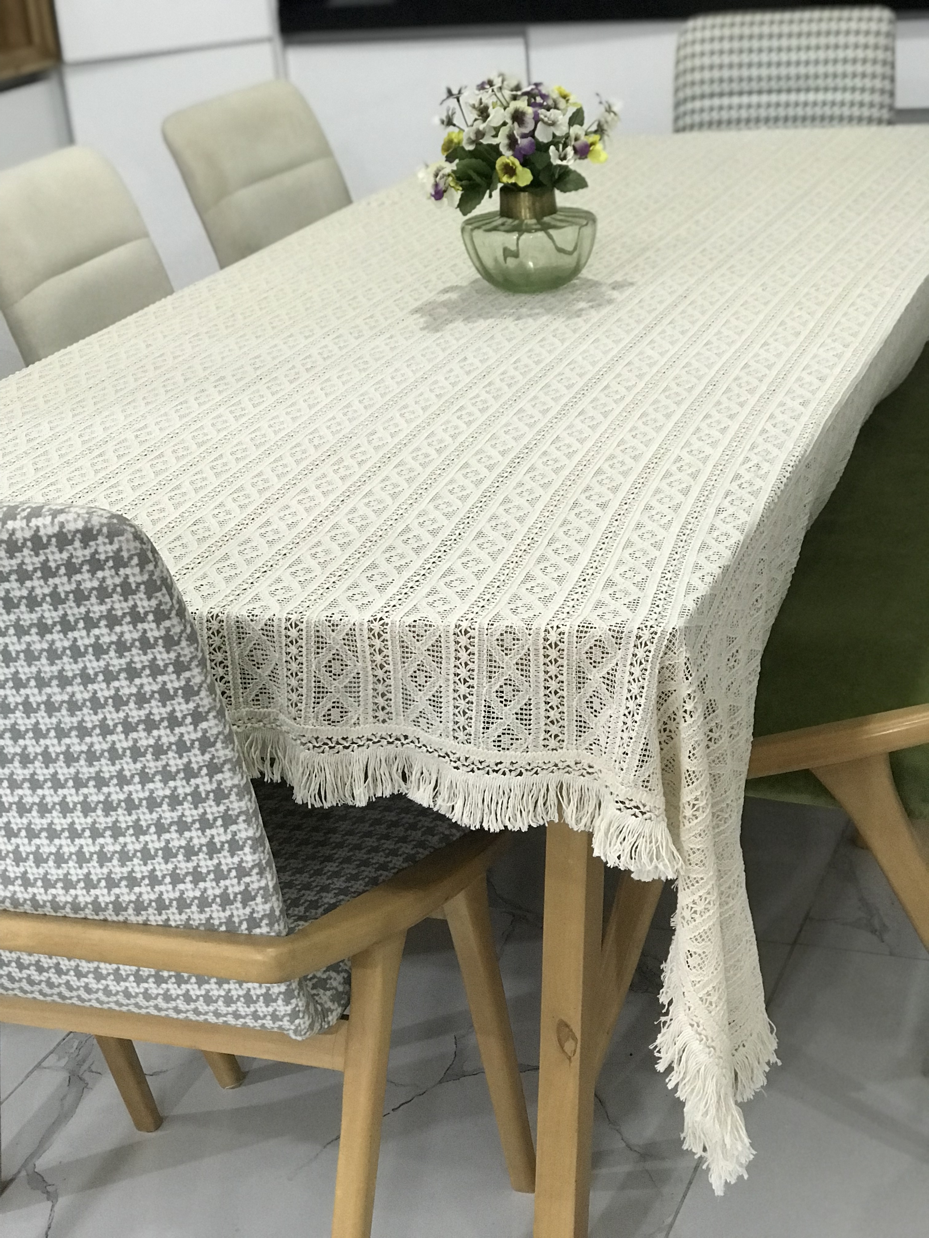این رومیزی، نمونهای بسیار ظریف از سبک Organic-Boho است که با بافت گیپوری پنبهای دستبافت طراحی شده. رنگ آن کرم طبیعتی (Natural beige) است و منگولههای بلند تابیده و نرم در لبهها دارد که حالت گرم و دنج به فضا میدهد.