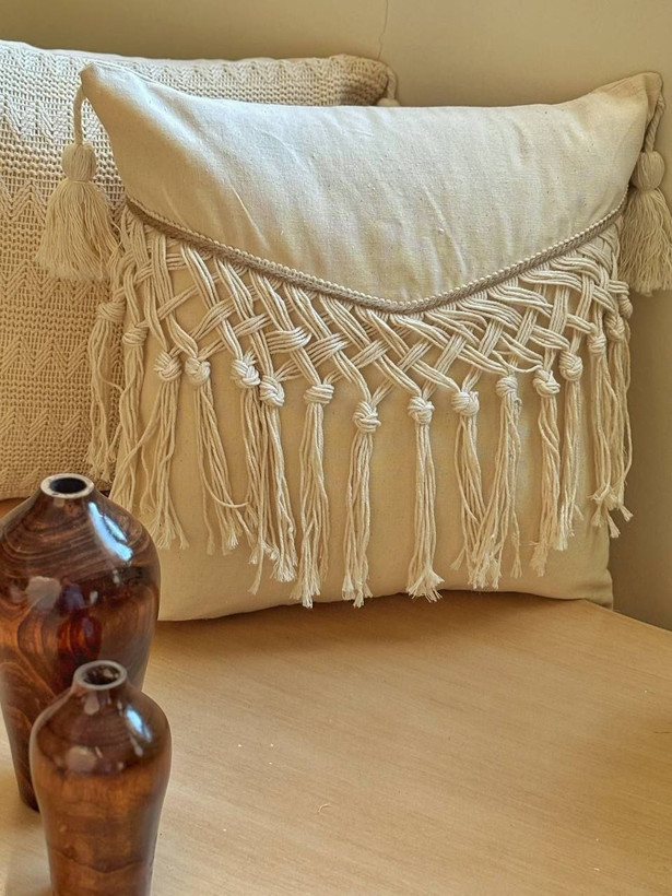 **کاور کوسن بافت سبدی و پایین ساده با ریشه و منگوله – رنگ کرم طبیعی**
