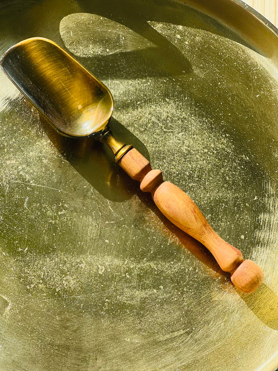 پیمانه یا اسکوپ با بدنهی فلزی براق و آبکاری طلایی طراحی شده و دارای دستهی چوبی استوانهای روشن است که با اتصال فلزی مخفی به بدنه متصل شده است. درخشش طلایی فلز در کنار گرمای چوب حس توازن بین لوکسبودن و طبیعیبودن ایجاد میکند.