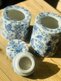 این دو جار از چینی لعابدار دستساز ساخته شدهاند و سطح آنها با نقوش آبی کبالت الهامگرفته از طرحهای داماسک و موتیفهای گل شاهانه تزئین شده است. لبه و درپوش با نوار طلایی ظریف و دستهی مخروطی طلایی براق در بالا آراستهاند که در ترکیب با پایهی سفیدِ شیری ظرف، جلوهای لوکس و متقارن ایجاد کرده است.