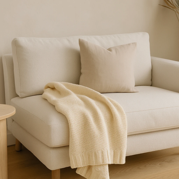 شال مبل از ترکیب نخ پنبهای ‑ اکریلیک با بافت کوهانی ساخته شده که لمس آن بسیار نرم، گرم و سبک است. بافت ریزِ برجسته و لبههای کشباف ظریفش حس دستی و خانگی میدهد و دقیقاً همان هارمونی دلخواه سبک را با مبلهای بژ یا شیری ایجاد میکند.