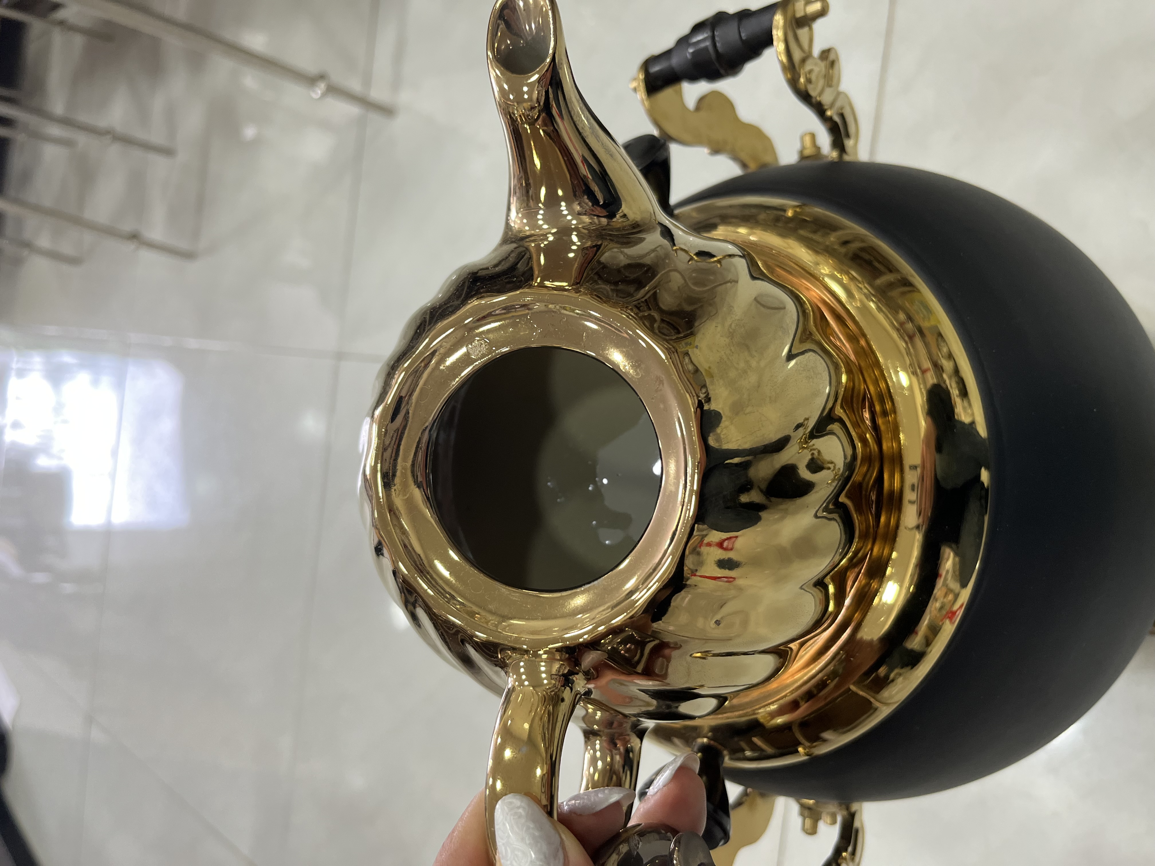 جنس بدنه استیل و رنگ کوره ایی و جنس قوری چینی
