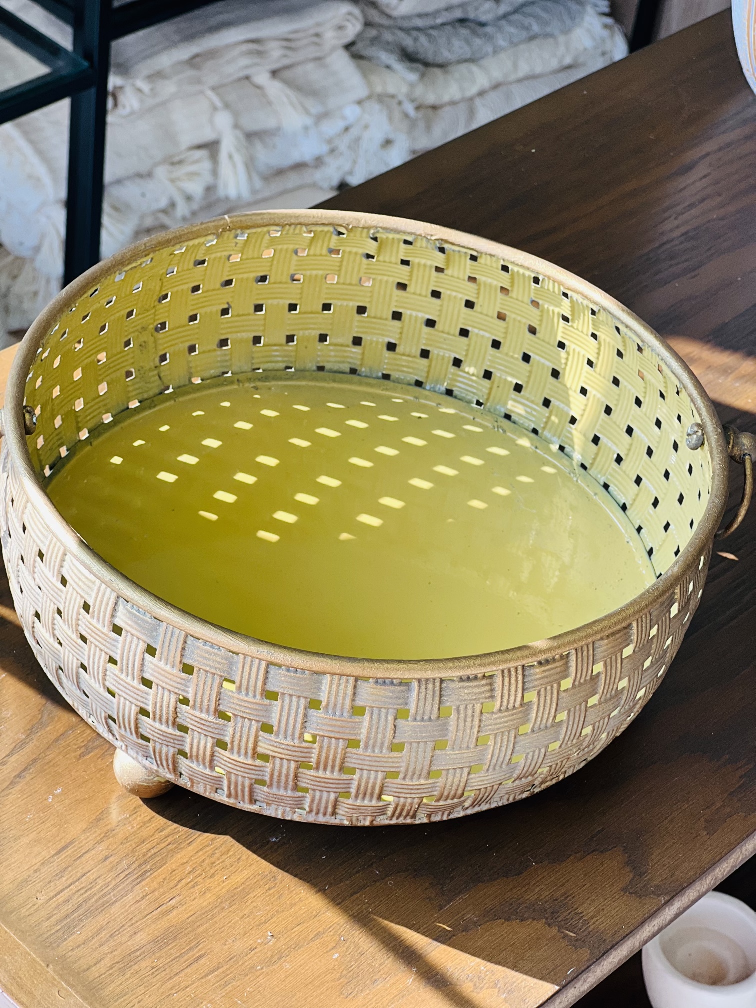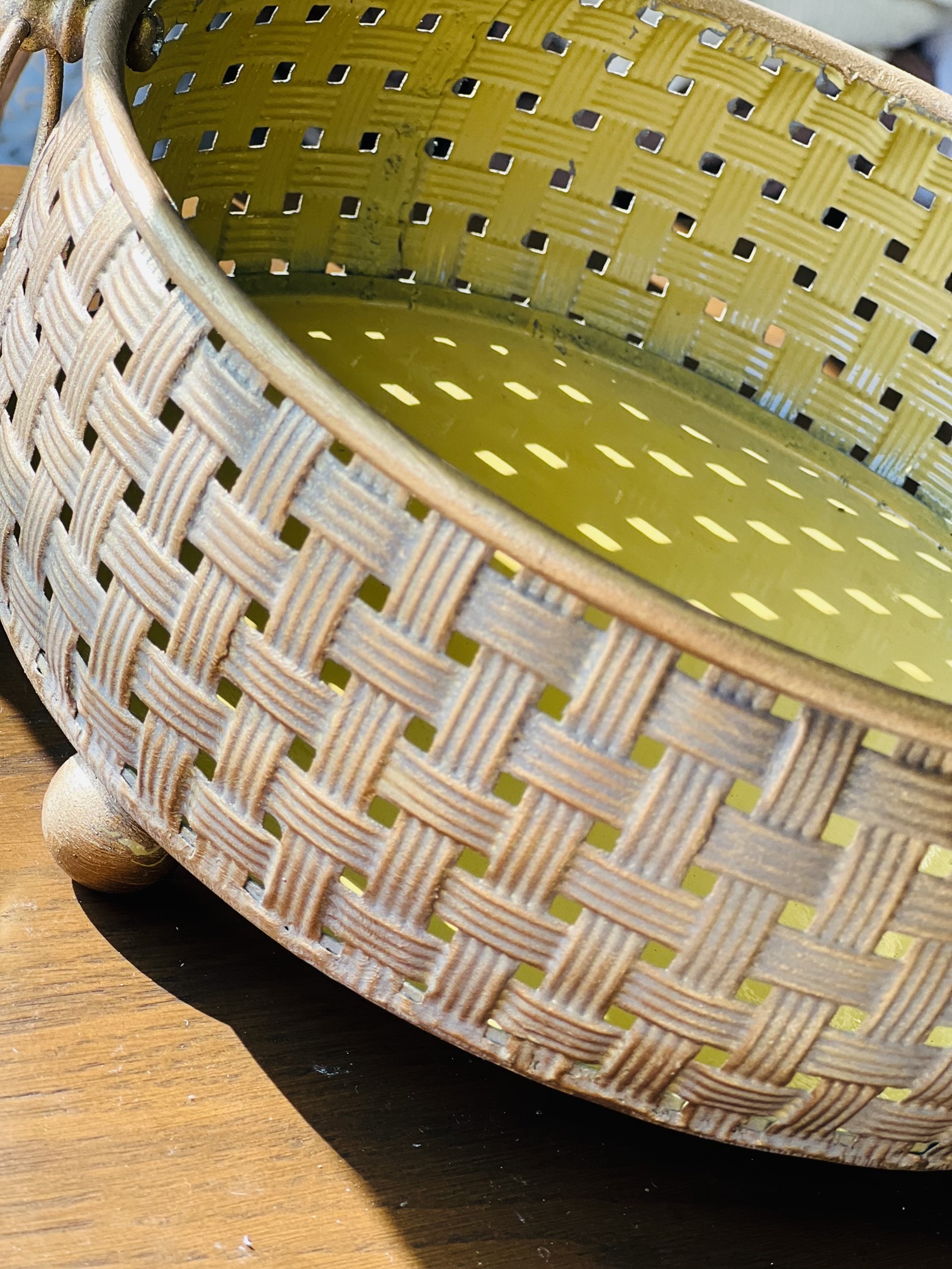 - رنگ: (طلایی ماسهای مات)• بافت بیرونی: طلایی عتیقه با کمی پَتینه کرمی• داخل ظرف: طلایی روشنتر و براقتر• لحن کلی رنگ: گرم، طبیعی،