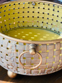 - رنگ:• بیرون :طلایی ماسهای با پتینه کرمی• داخل: طلایی لیمویی روشن، براقتر• دستهها و پایهها: طلایی پتینهای