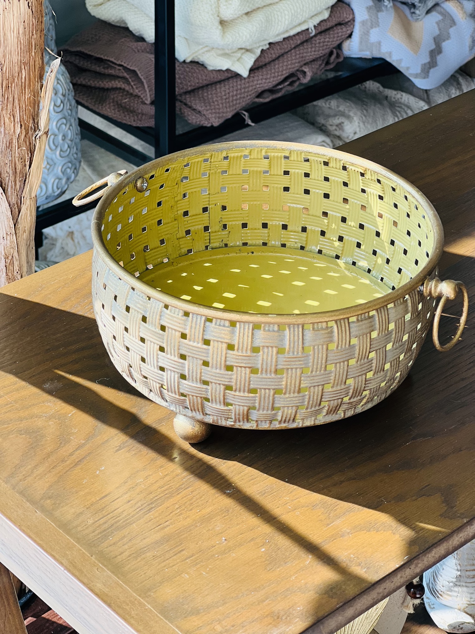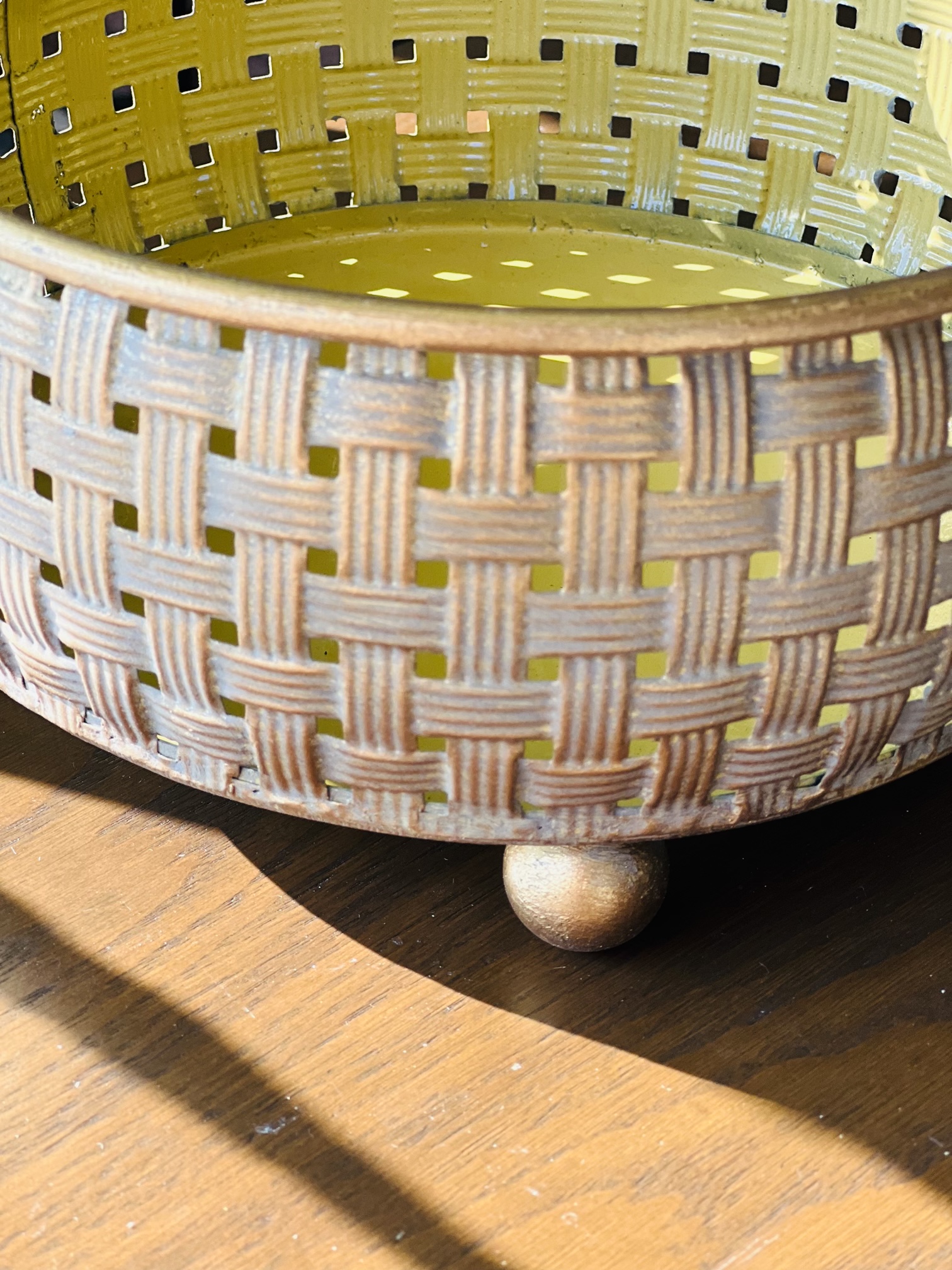 - رنگ:• بیرون :طلایی ماسهای با پتینه کرمی• داخل: طلایی لیمویی روشن، براقتر• دستهها و پایهها: طلایی پتینهای