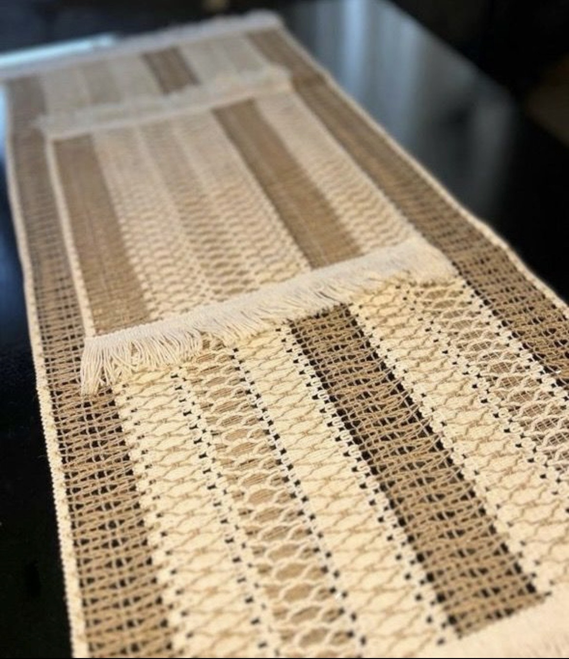 • الگوی بافت مشبک همراه با نوارهای موازی کرم، بژ شنی و قهوهای گرم