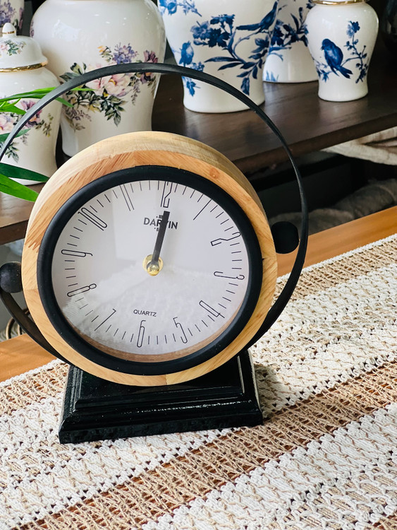 • بدنهی گرد ساعت از چوب بلوط روشن ساخته شده و درون قاب فلزی دایرهای مشکی قرار گرفته که ظاهری شناور و سبک به آن میدهد.