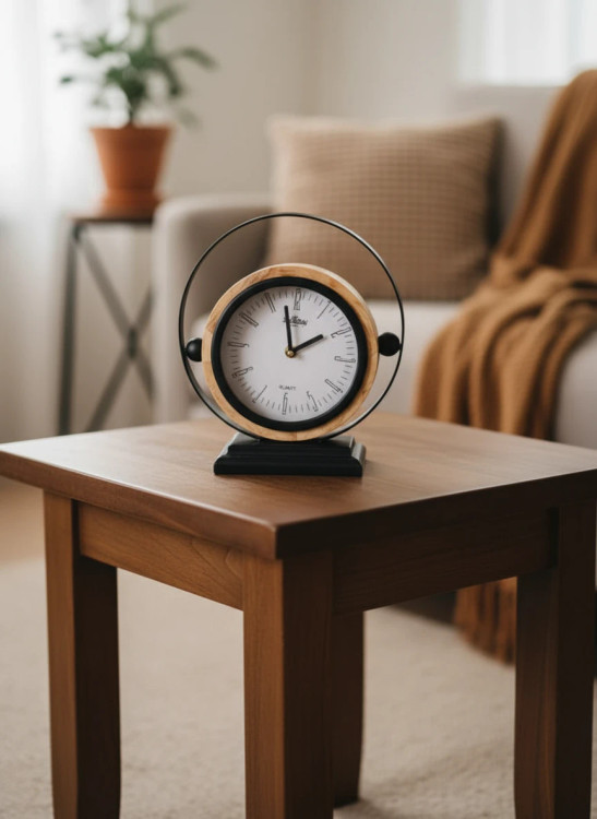 بدنهی گرد ساعت از چوب بلوط روشن ساخته شده و درون قاب فلزی دایرهای مشکی قرار گرفته که ظاهری شناور و سبک به آن میدهد.