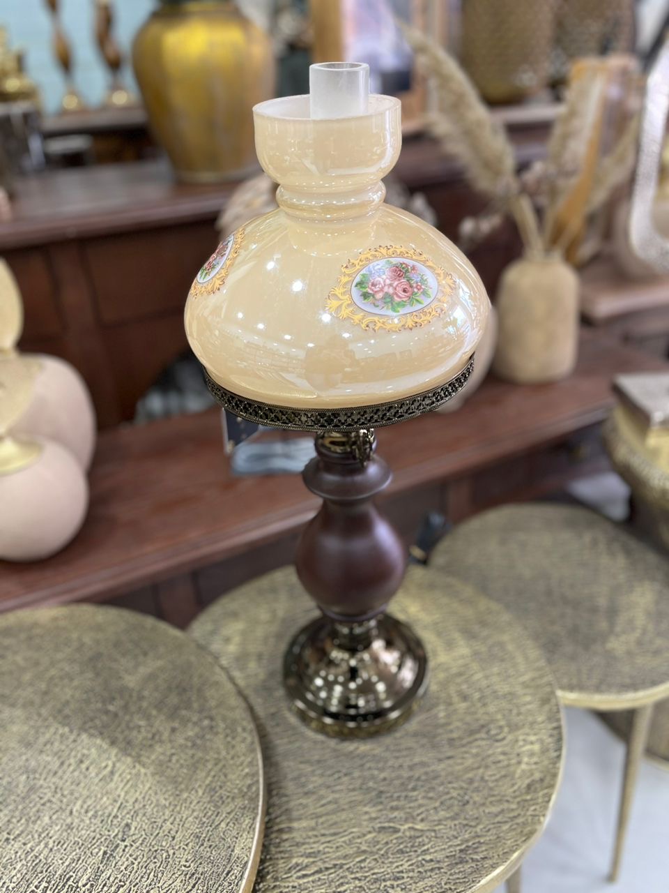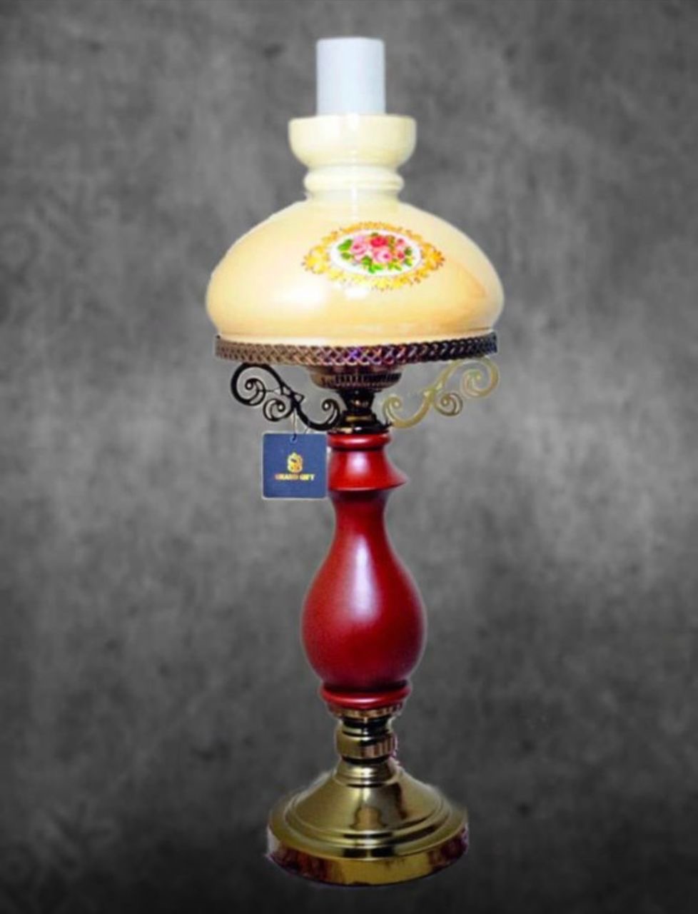 • طراحی برگرفته از چراغهای قدیمی روغنی با ترکیب بدنهی چوبی‑فلزی و شید شیشهای نقاشیشده.