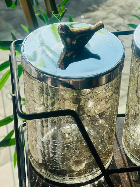 این ست جاادویه شامل ۶ ظرف شیشهای ترکدار با درب فلزی براق طرح پرنده است که داخل یک استند فلزی دو طبقه قرار گرفته. طراحی خاص شیشهها در ترکیب با دربهای دکوری، جلوهای لوکس، دکوراتیو و گرم ایجاد کرده و همزمان برای نگهداری ادویه، دمنوش، شکر، قهوه یا اقلام خشک آشپزخانه کاملاً کاربردی است.