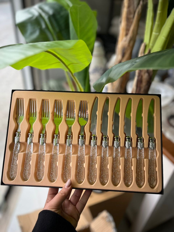 این یک ست شیک و دکوراتیو کارد و چنگال است که برای پذیرایی، دسر، کیک و میوه استفاده میشود. دستهها شفاف و اکلیلی هستند و محل اتصال دسته به فلز با طرح برجسته خوشه گندم تزیین شده که جلوهای بسیار لوکس و خاص به میز پذیرایی میدهد.