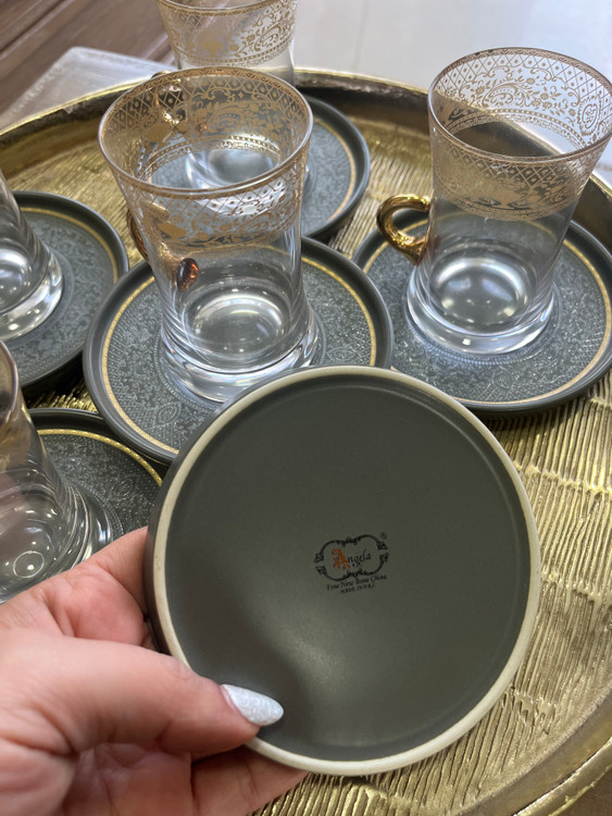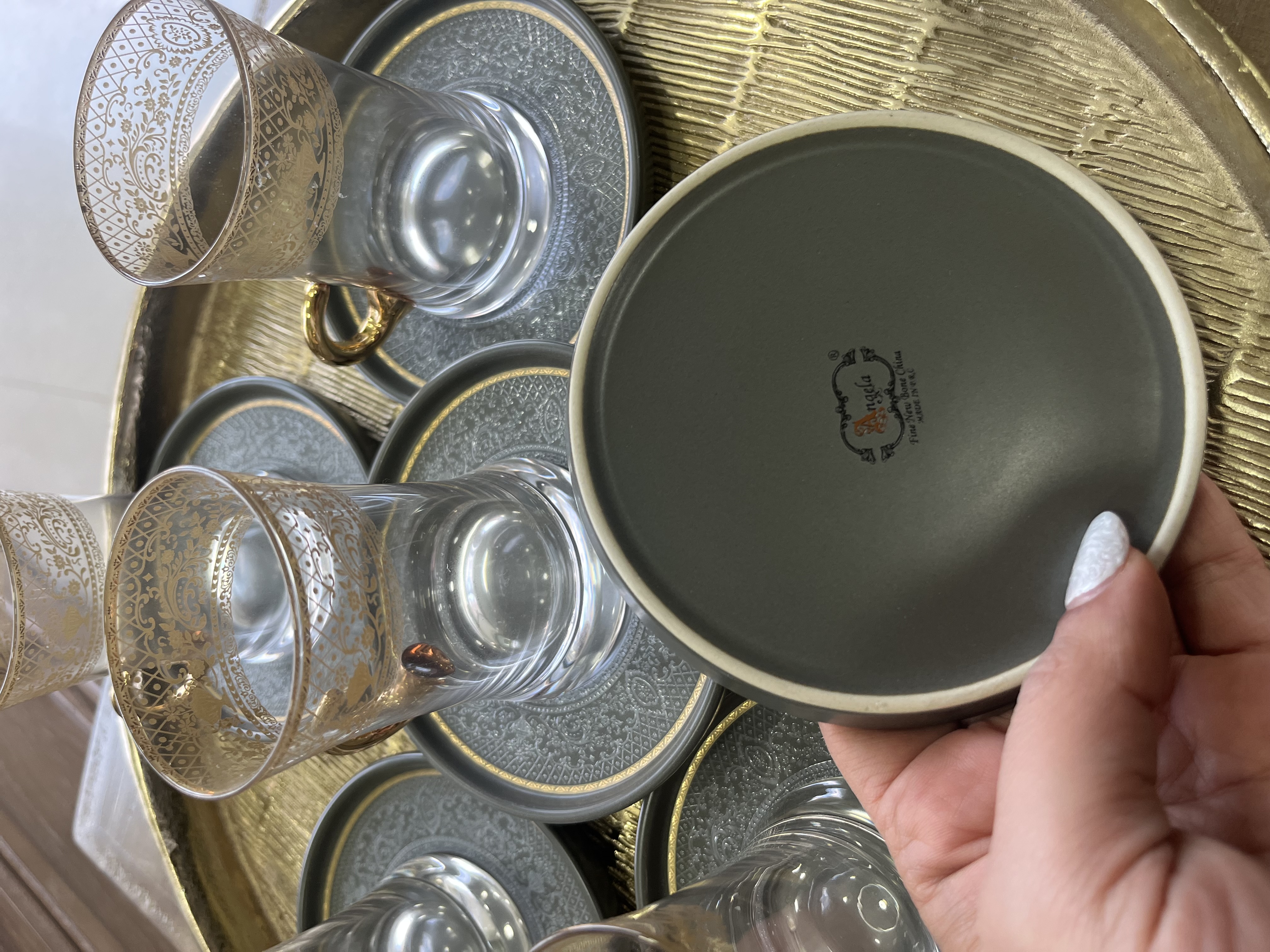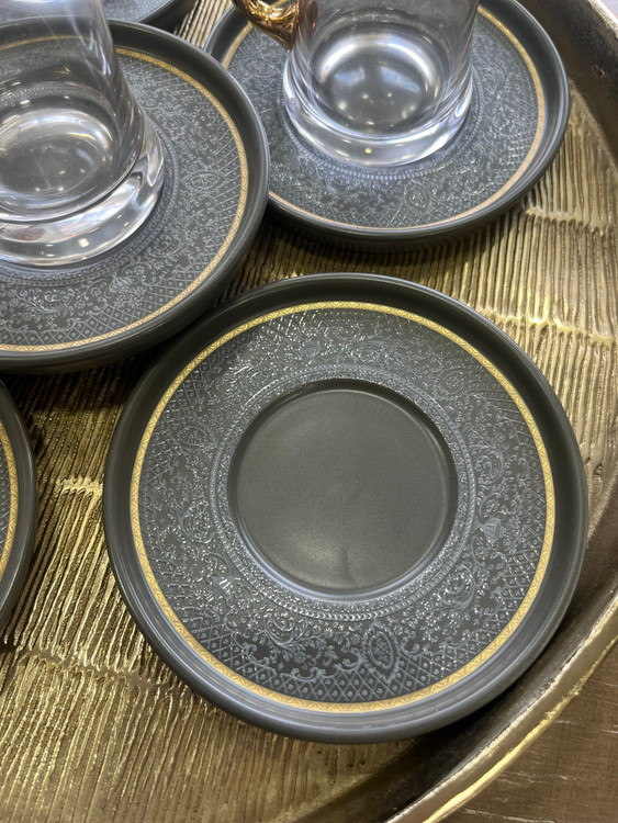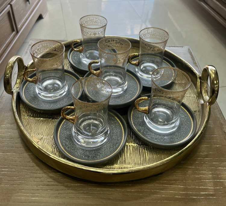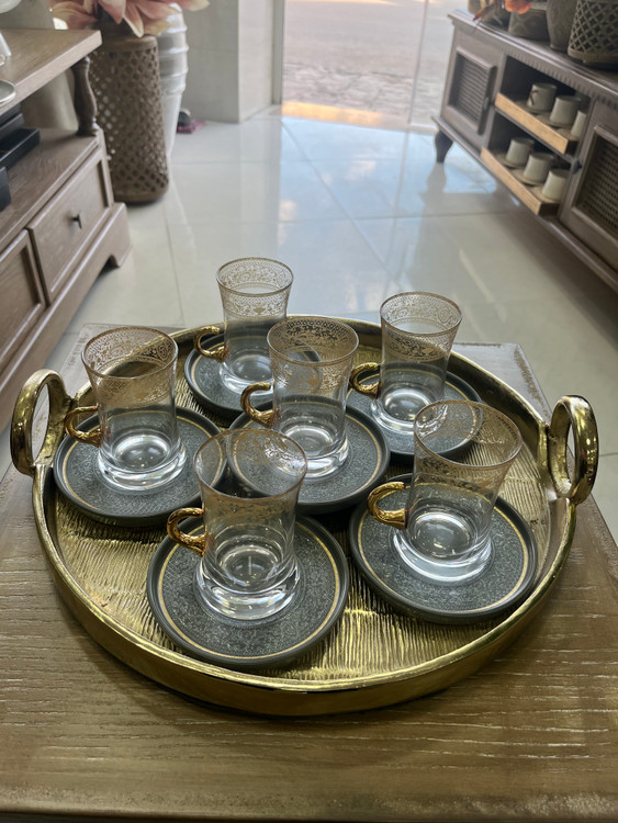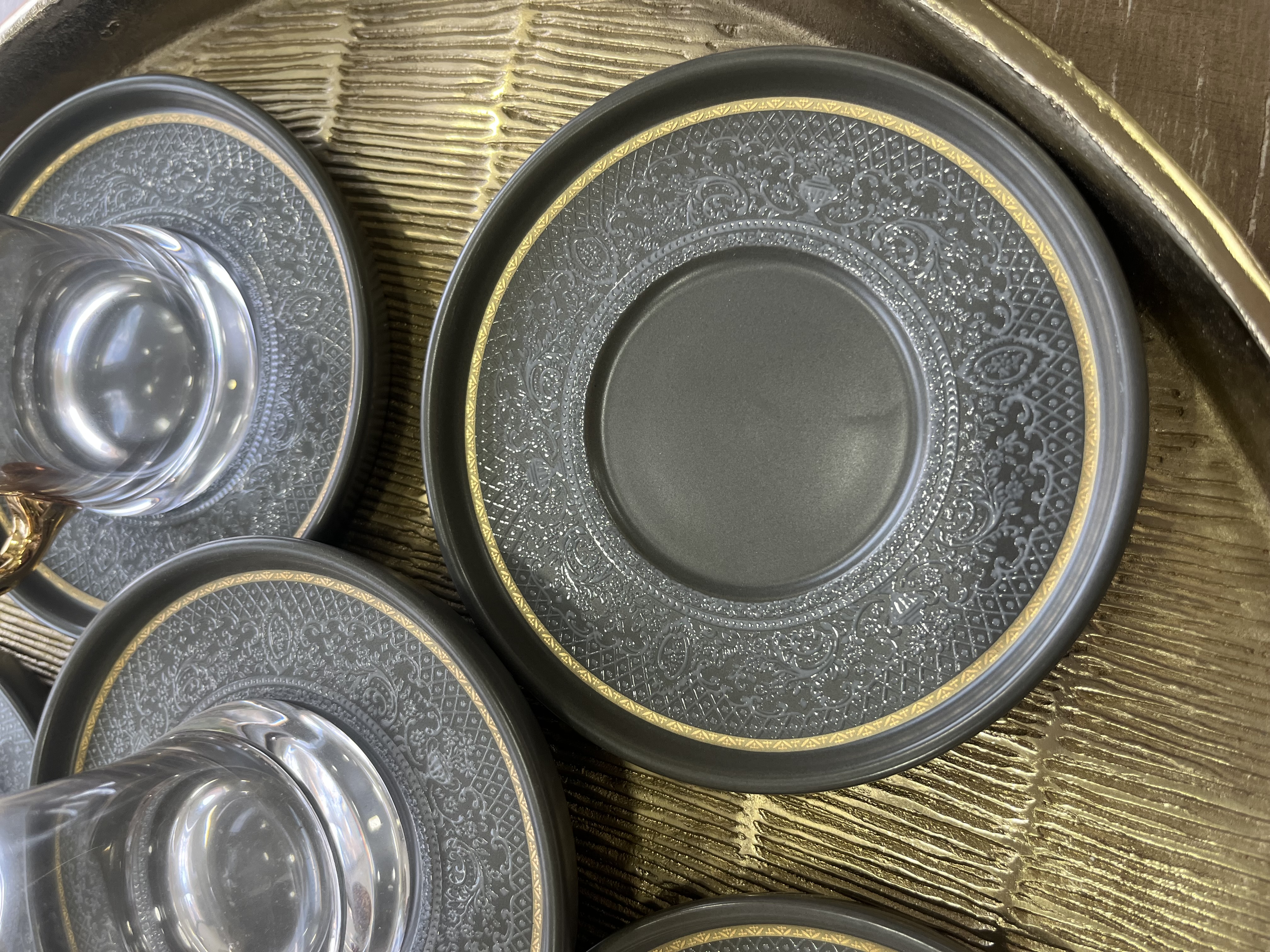 - طراحی منحصر به فرد: بهرهگیری از نعلبکیهای با بافت سنگی/سرامیکی تیره که تضاد زیبایی با رنگ طلایی سینی ایجاد کرده است.