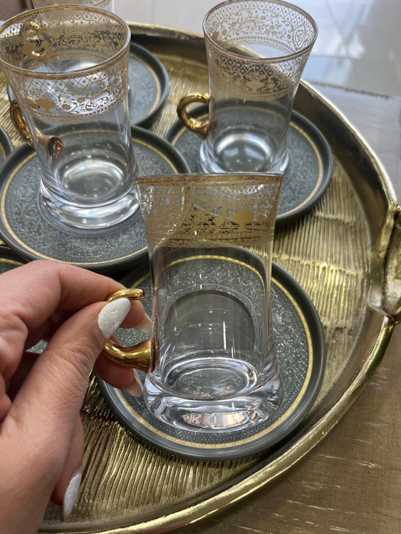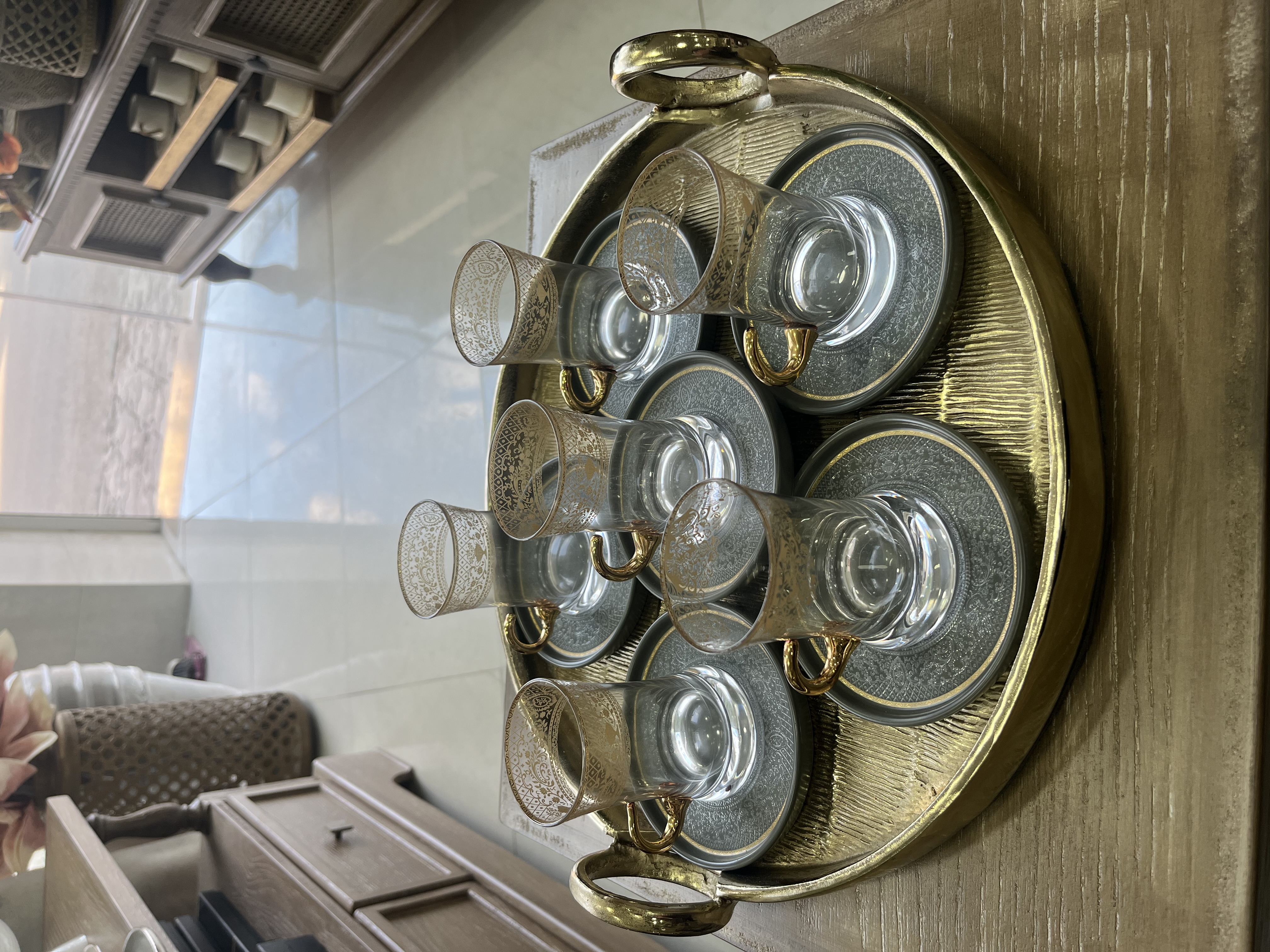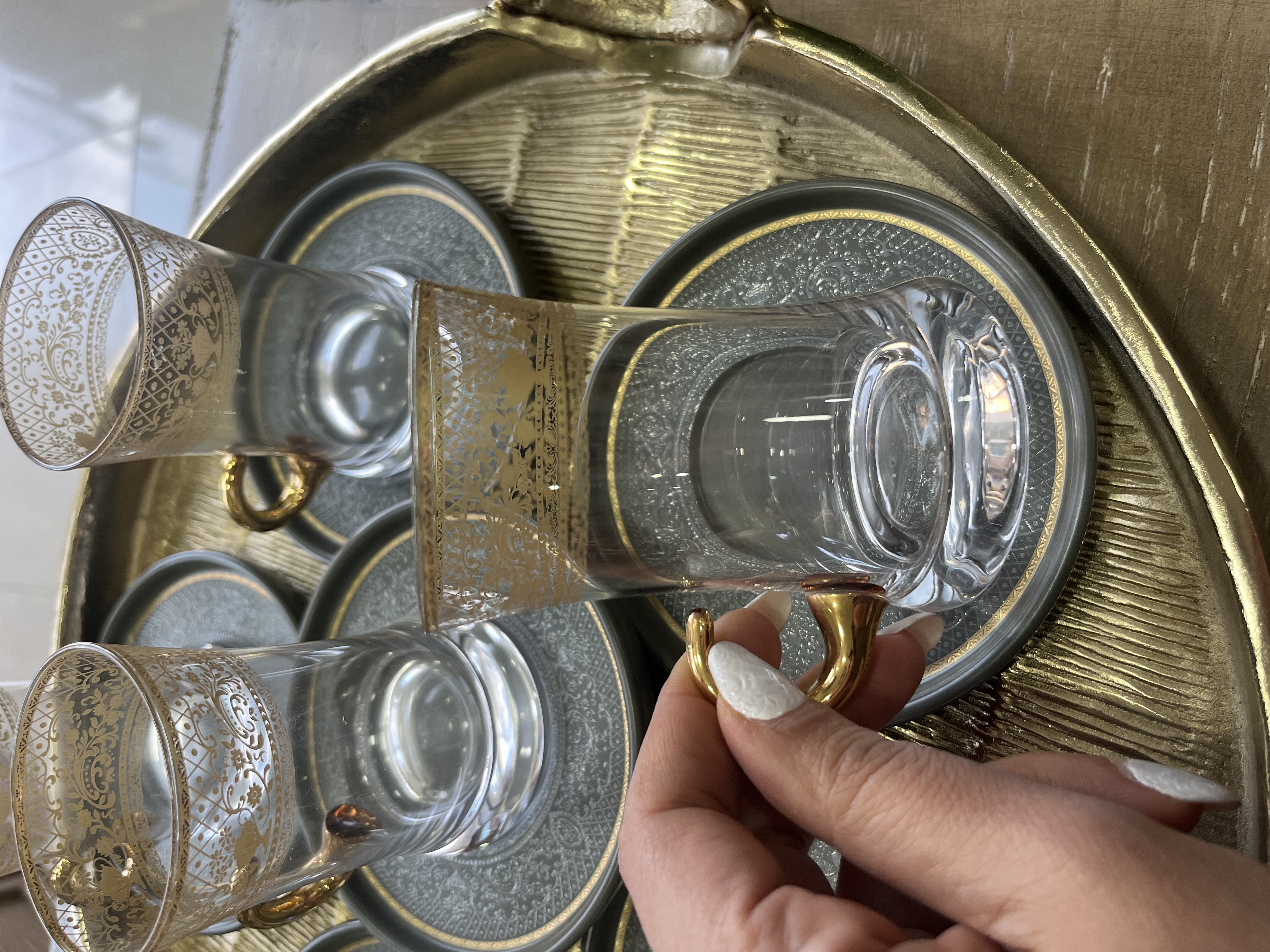 - کیفیت ساخت بالا: استکانهای بلور شفاف با لبههای طلایی و سینی فلزی مقاوم در برابر تغییر رنگ.