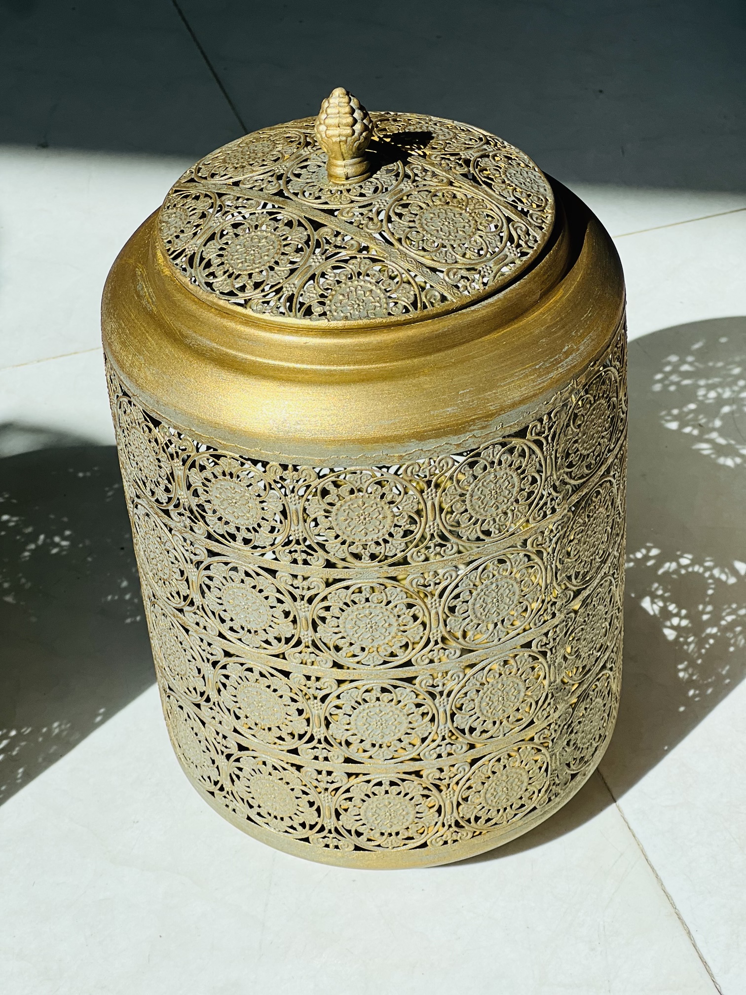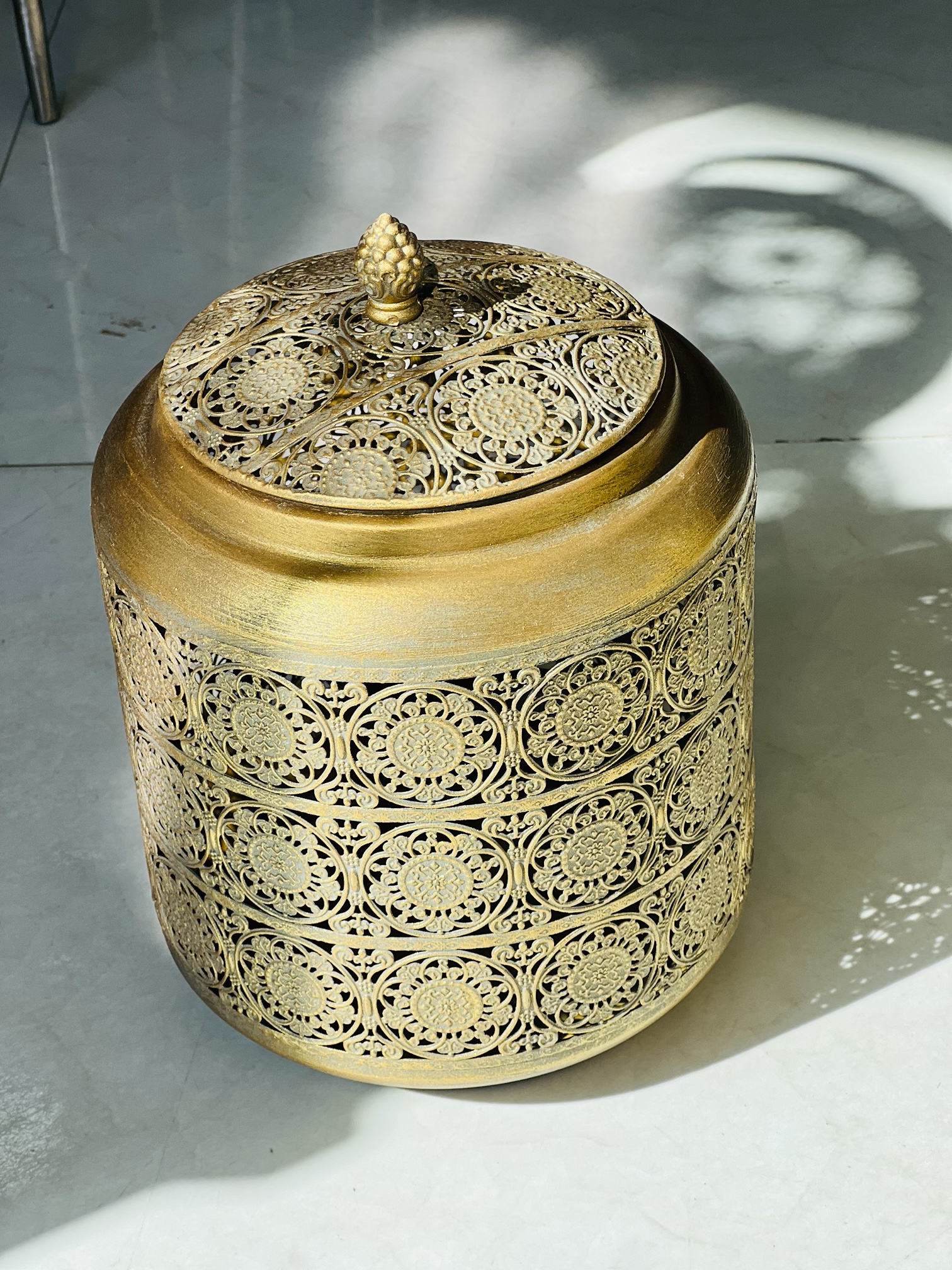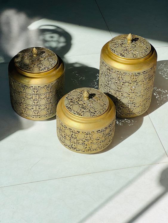 این بانکههای فلزی مراکشی با طراحی مشبک سنتی، در سه سایز متفاوت ارائه شدهاند و از نظر زیباییشناسی، جزو آیتمهای دکوراتیو–کاربردی بسیار لوکس محسوب میشوند. ترکیب فرم استوانهای، دربدار بودن و رنگ طلایی پتینهای باعث شده این بانکهها هم برای نگهداری مواد خوراکی خشک و هم بهعنوان اکسسوری دکوراسیون استفاده شوند.