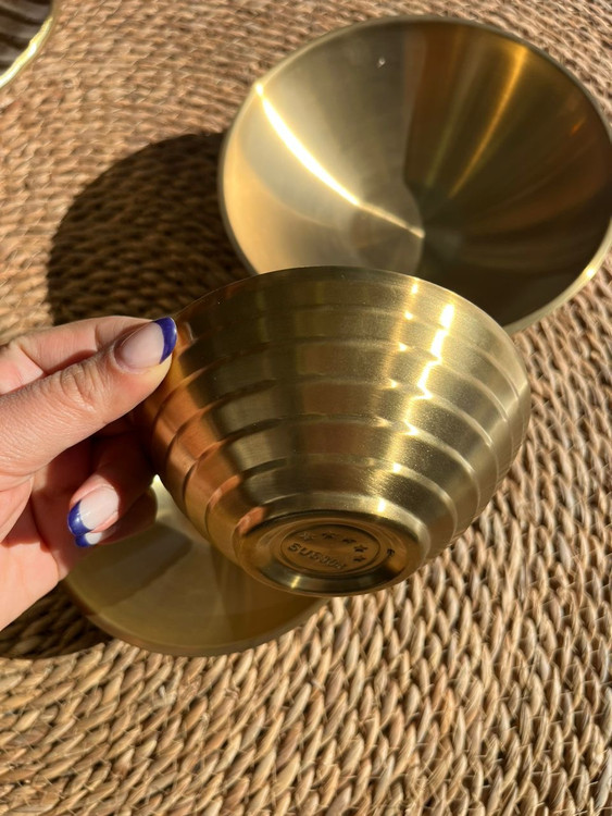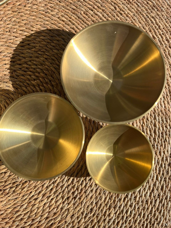 این سه کاسهی طلایی با طراحی مینیمال و جنس فلز مات چکشخورده ساخته شدهاند و جلوهای لوکس و گرم به فضای آشپزخانه میدهند.