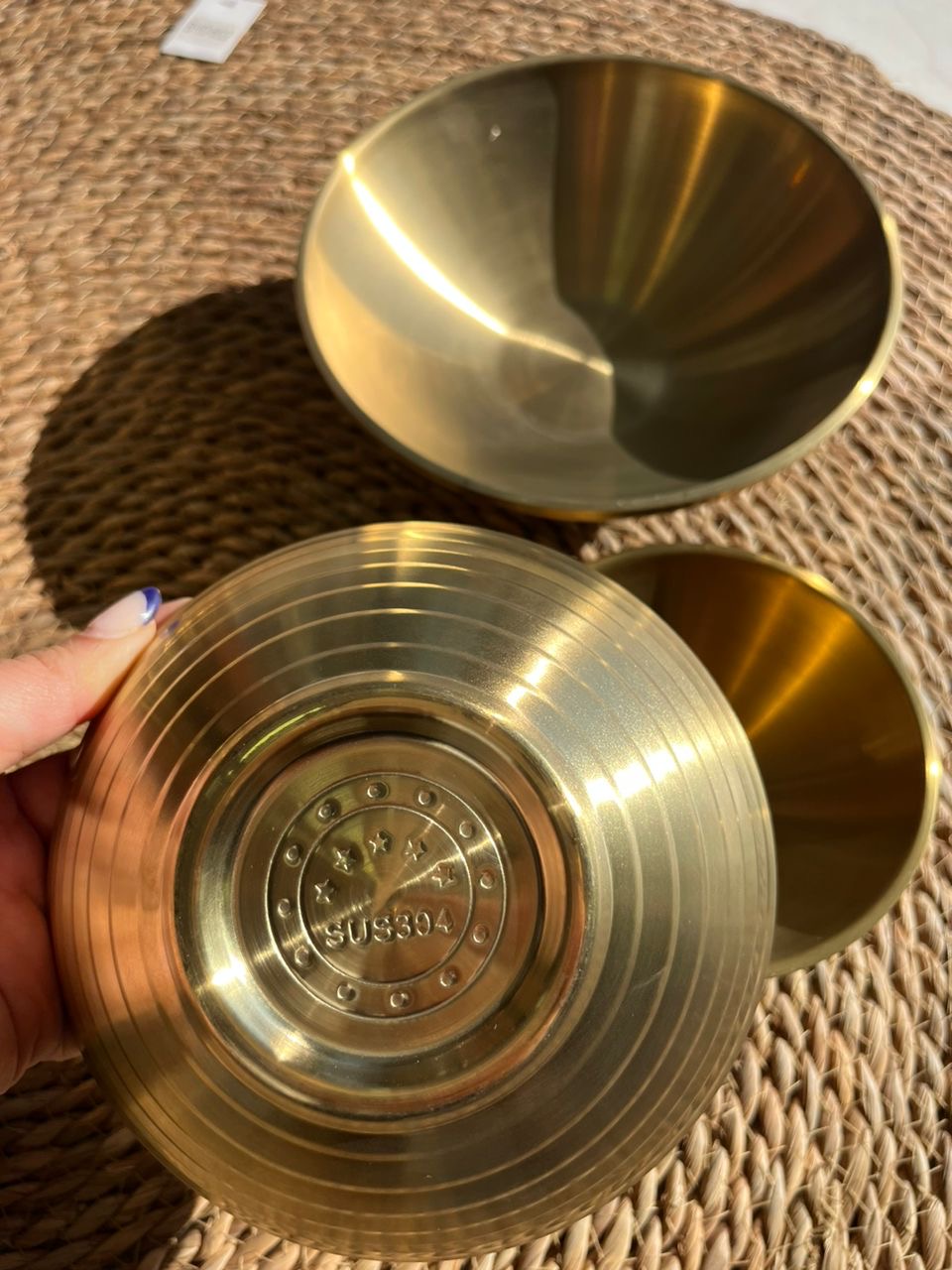 این سه کاسهی طلایی با طراحی مینیمال و جنس فلز مات چکشخورده ساخته شدهاند و جلوهای لوکس و گرم به فضای آشپزخانه میدهند.