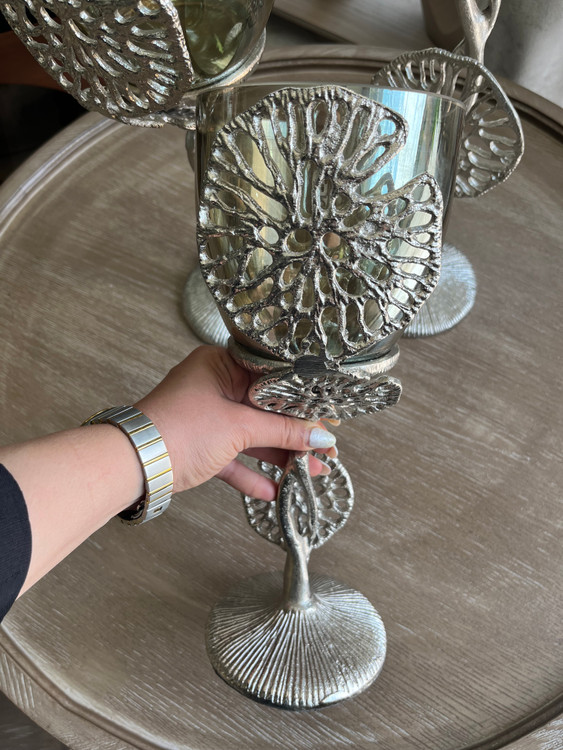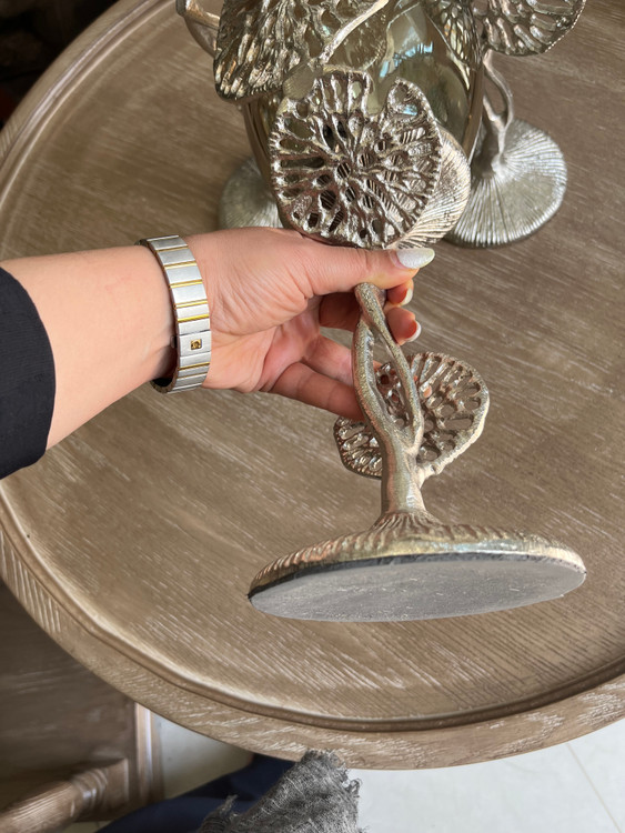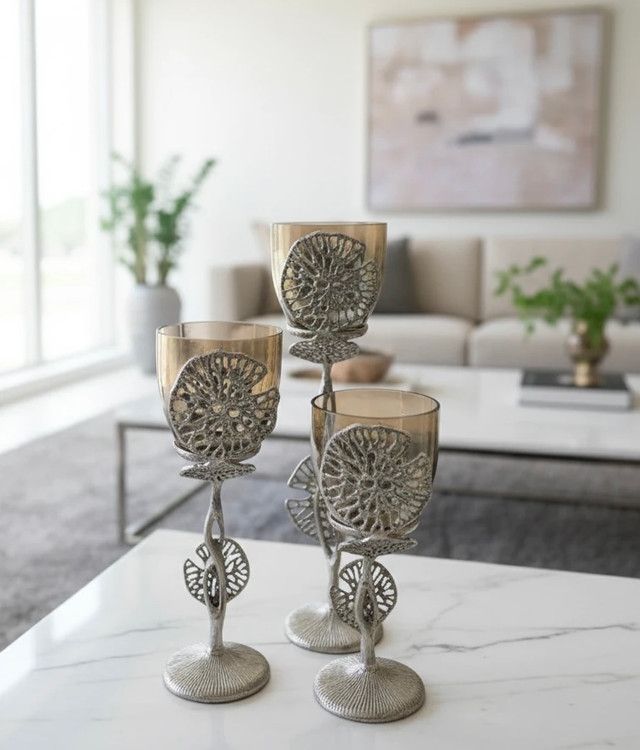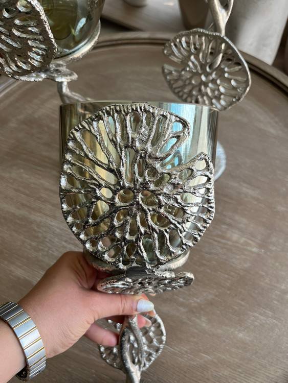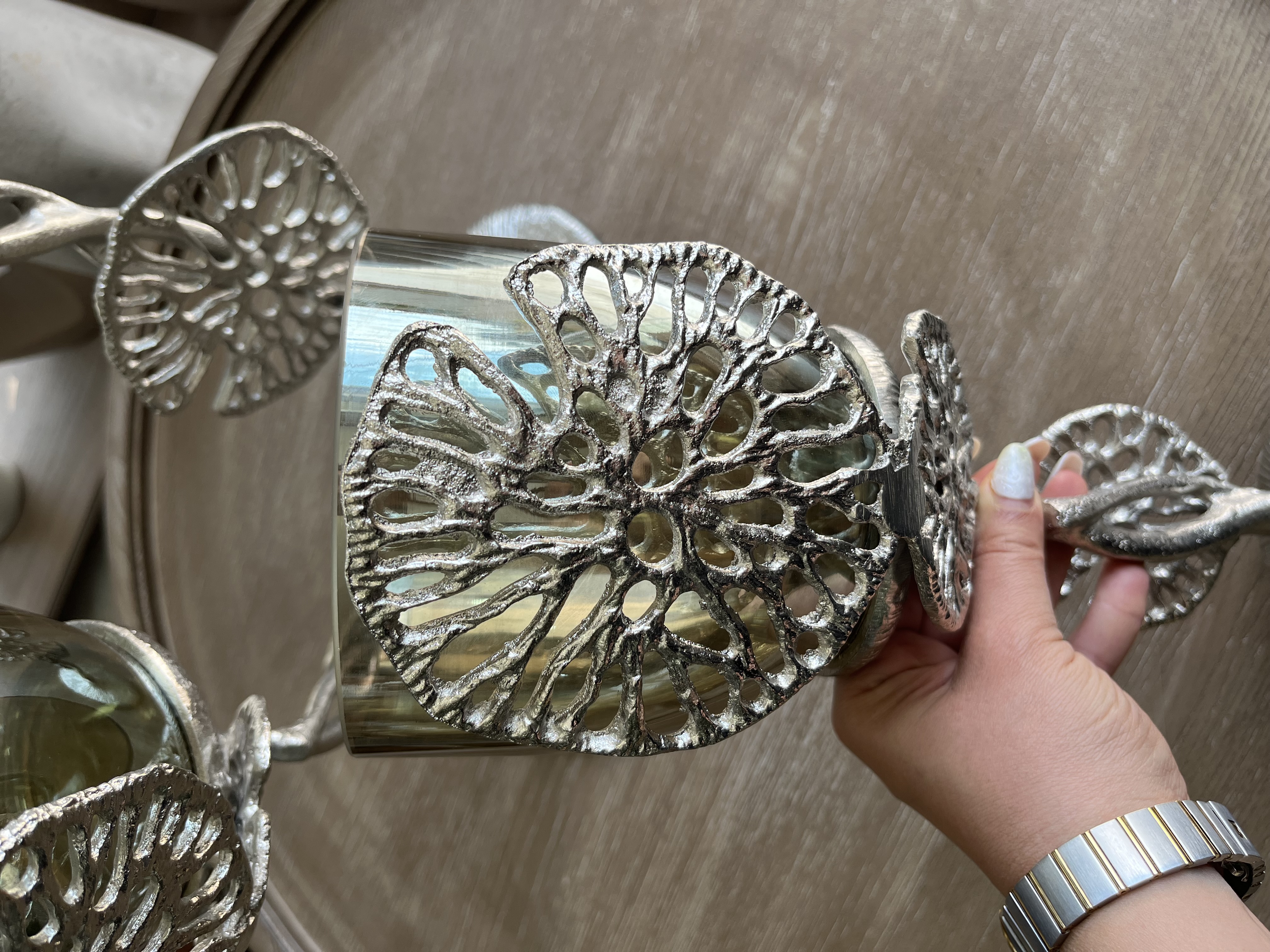 این ست شمعدان از آن دسته محصولاتی است که بلافاصله توجه بیننده را جلب میکند. طراحی منحصربهفرد برگهای فلزی روی بدنه، علاوه بر زیبایی، حس هنری و طبیعی به فضا میبخشد. ترکیب رنگ طلایی ملایم لیوانها با پایه فلزی نقرهای باعث شده محصول بهراحتی با دکورهای مختلف ست شود.