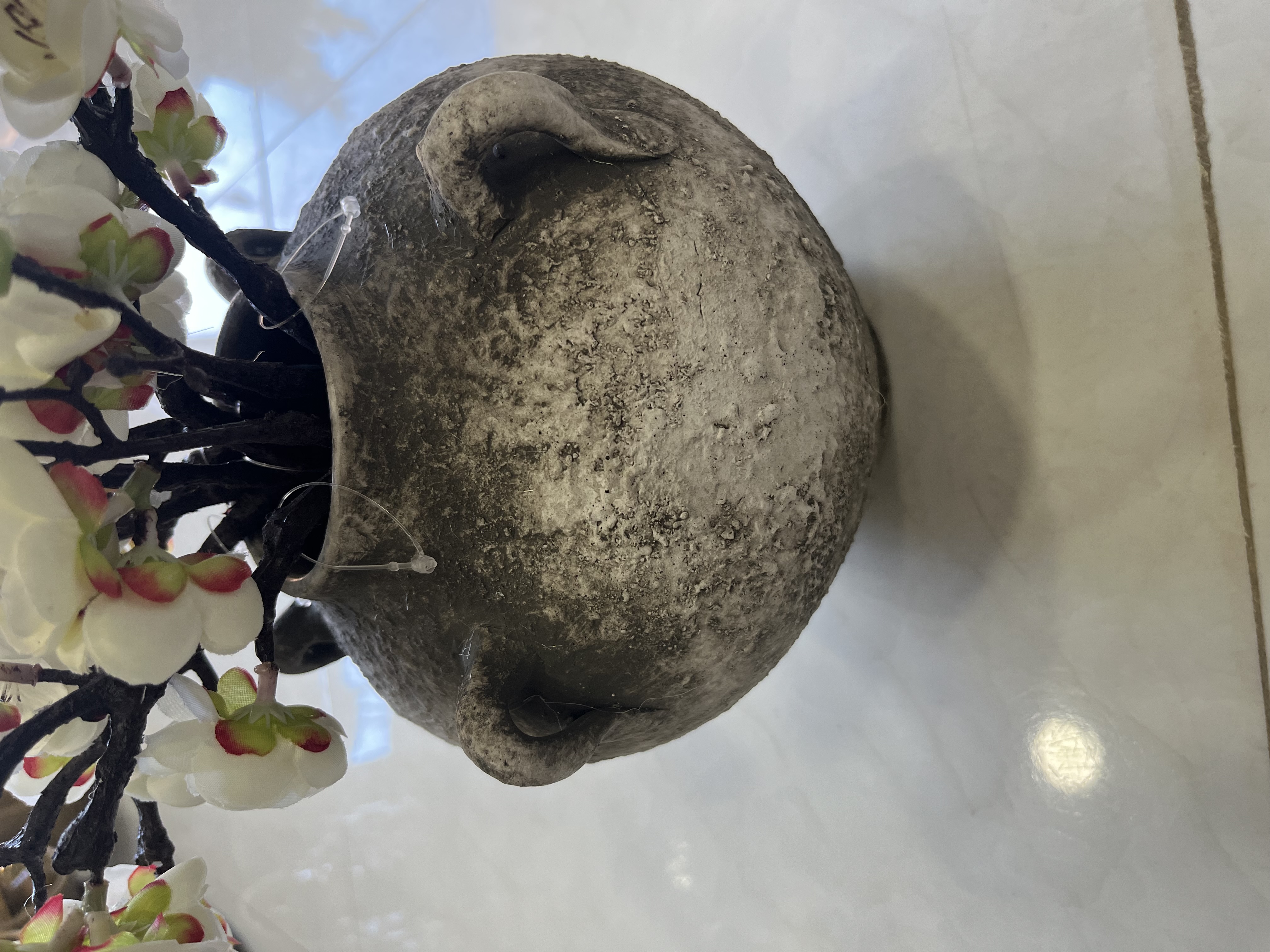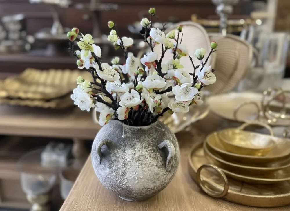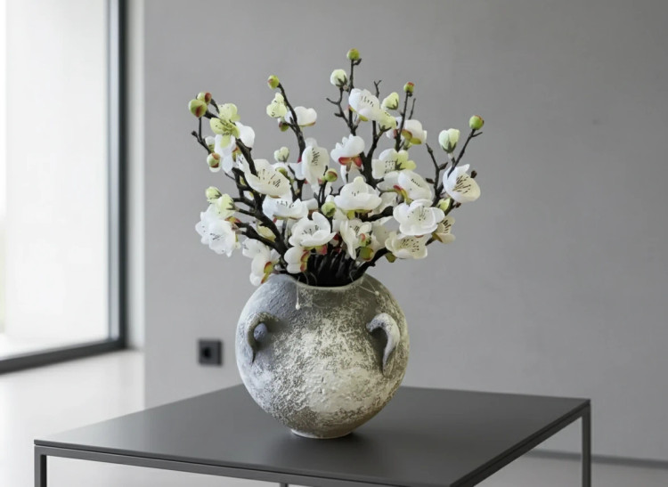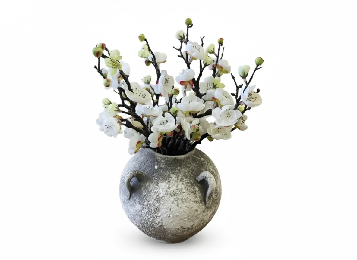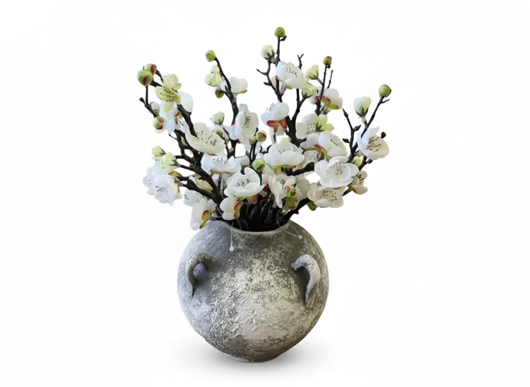 كلدان دكوراتيو خاكسترى به همراه شاخه هاى كل مصنوعى شكوفه سفيد، يك انتخاب شيك وجشمكير براى تكميل دكور هر محيط مدرن است. رنكَ خنثى كلدان با بافت سنكَى و حالت كهنه كارى شده، جلوهاى لوكس ايجاد مى كند وتركيب آن با كل هاى سفيد طبيعى نما، حس آرامش و لطافت را به فضا منتقل مى نمايد.