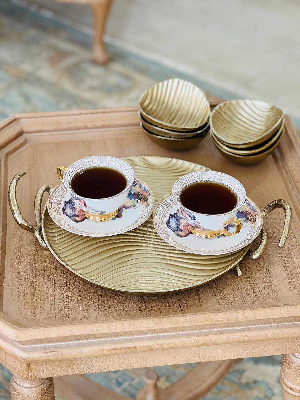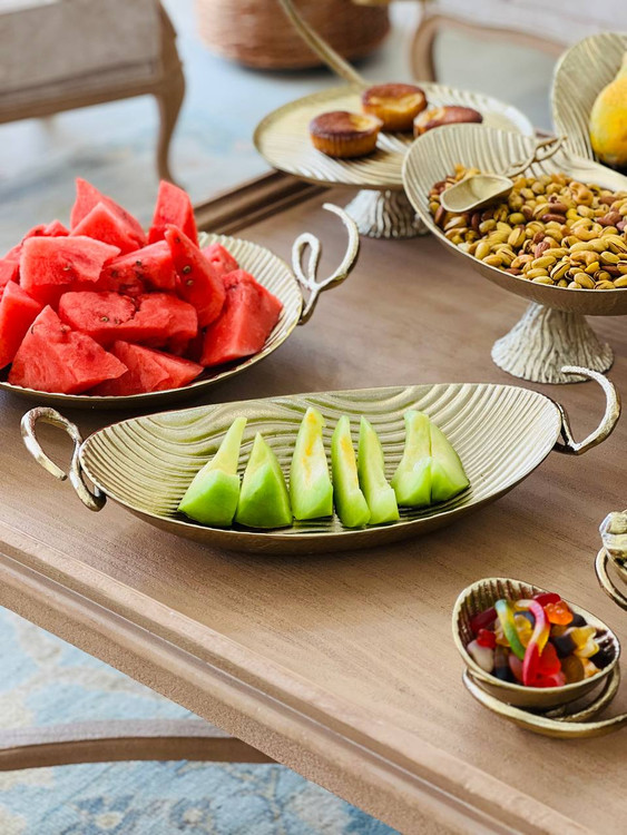 این سرویس پذیرایی از جنس آلومینیوم با آبکاری فورتیک تولید شده و دارای رنگ طلایی مات با ضمانت آبکاری و ضمانت تغییر رنگ میباشد. طراحی موجی این سرویس باعث شده جلوهای بسیار لوکس و مدرن داشته باشد و به راحتی با انواع دکوراسیونهای داخلی هماهنگ شود.