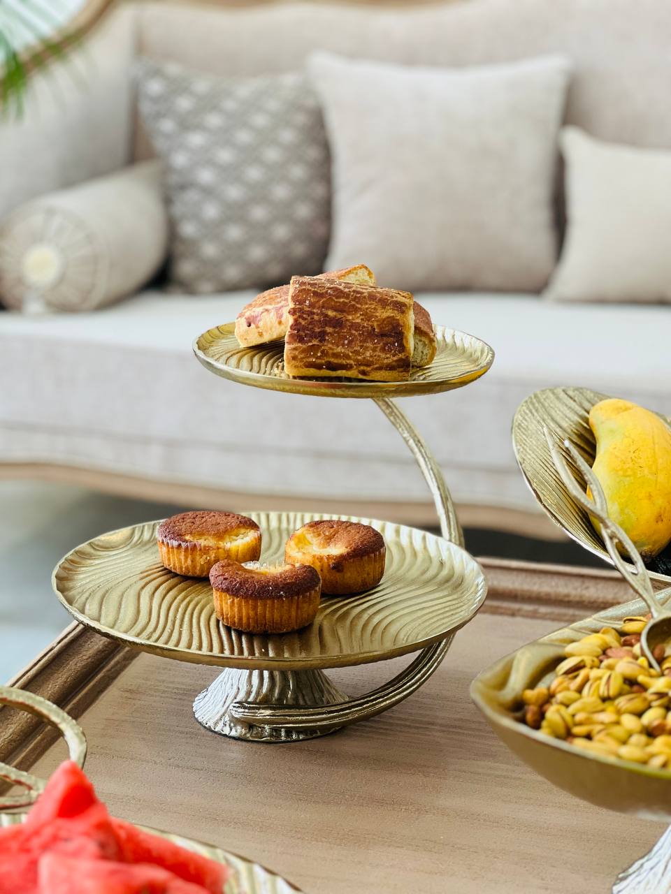 یکی از جذابترین قطعات این سرویس شیرینی خوری دو طبقه است که برای سرو انواع شیرینی، شکلات و دسر استفاده میشود.