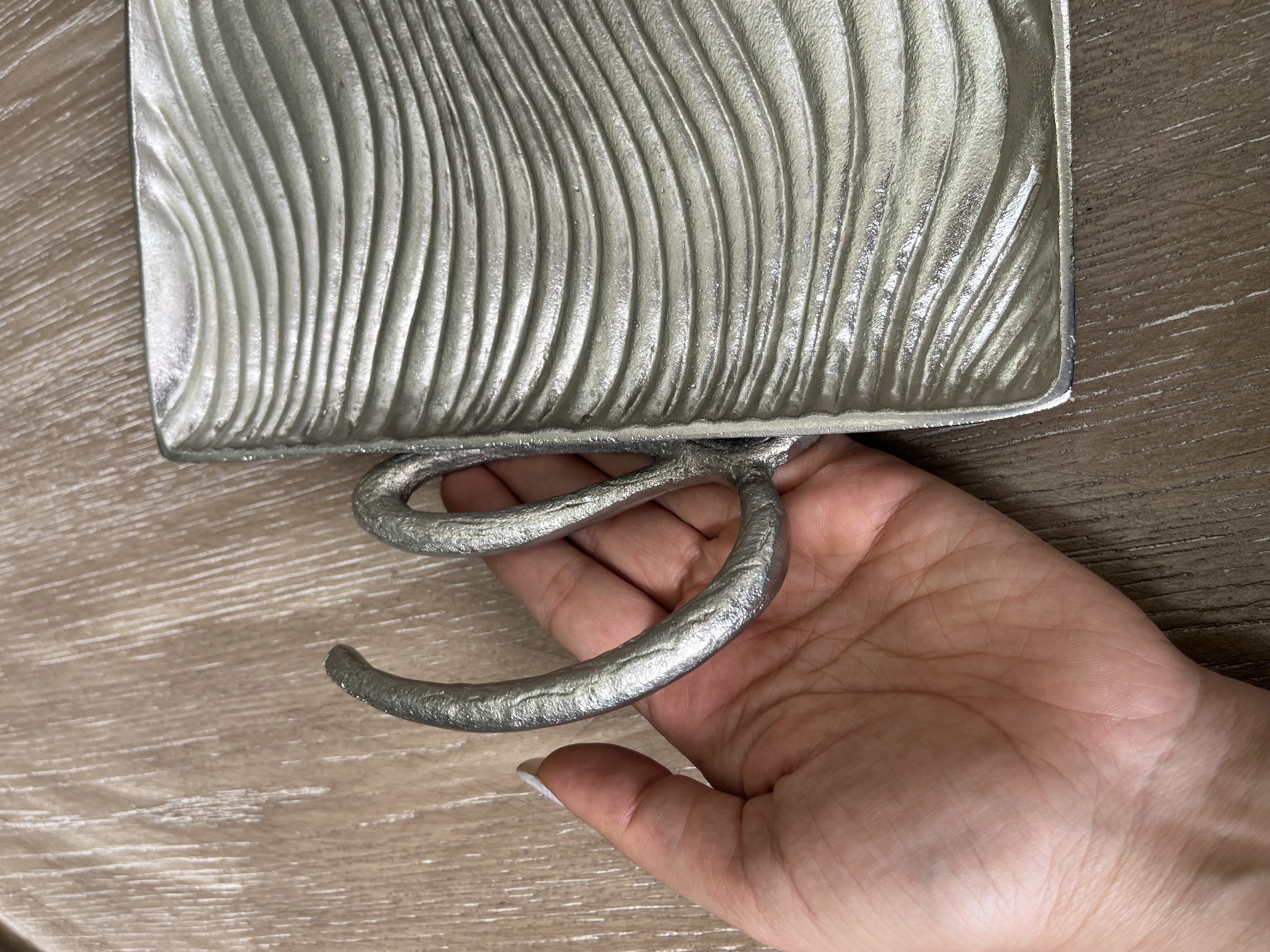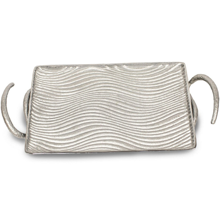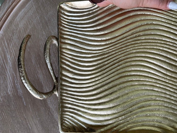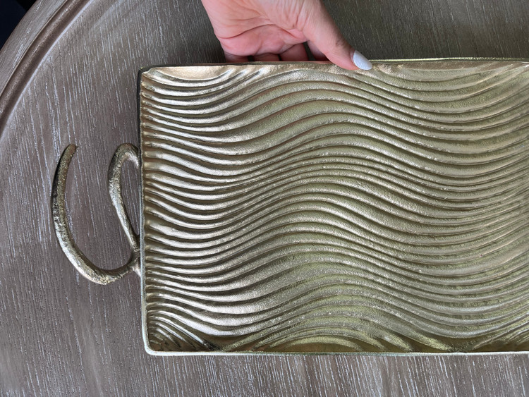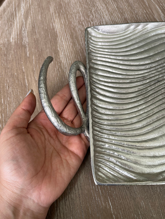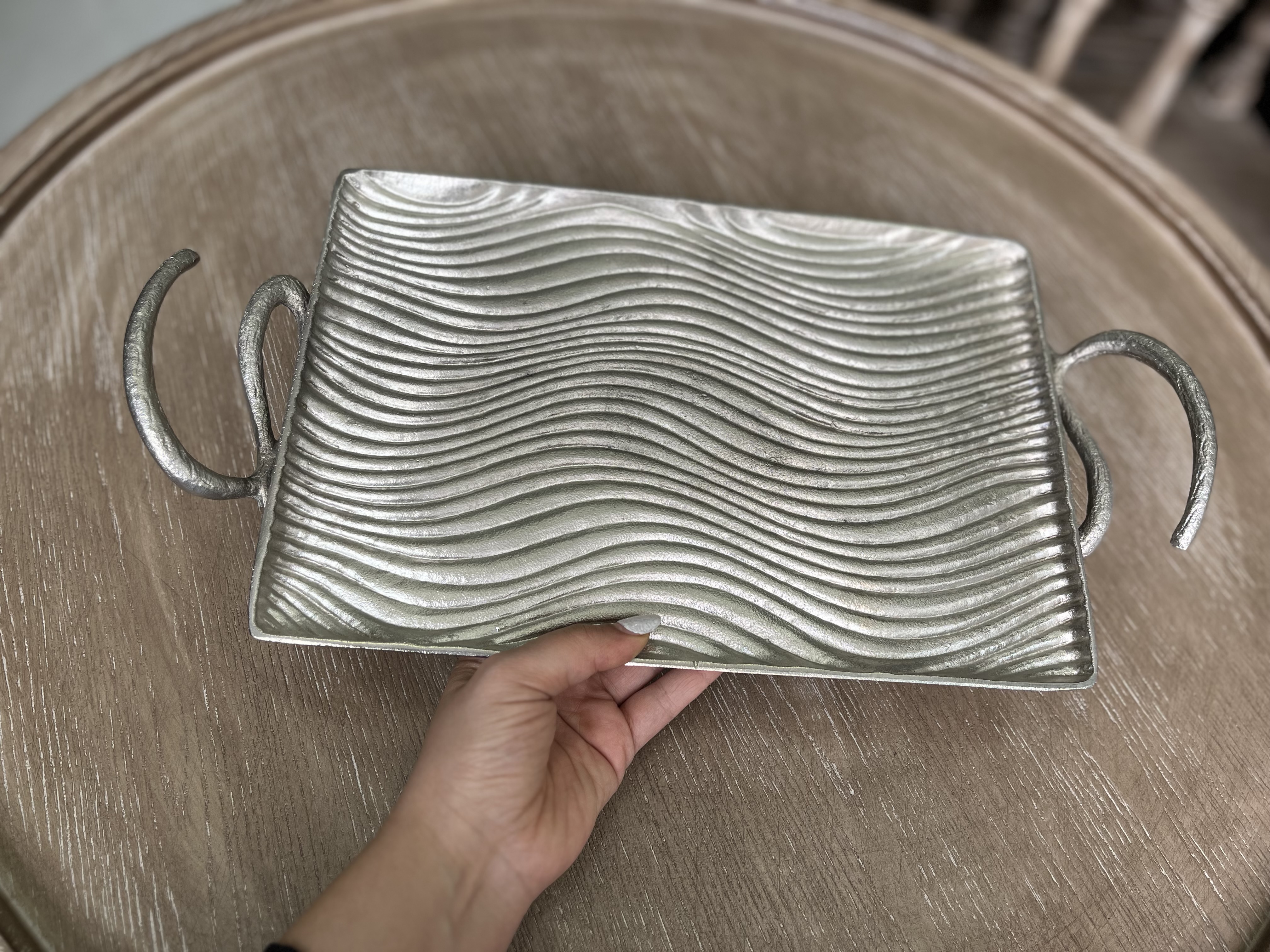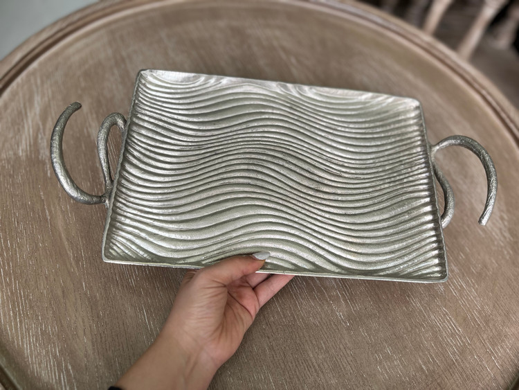 سينى فلزى مستطيلى طرح موج باطراحى خاص و مدرن، انتخابى عالى براى پذيرايي و دكوراسيون منزل است. سطح اين سينى با الكوى موجى برجسته طراحى شده كه علاوه برزيبايي، از سر خوردن ظروف نيز جلوكيرى مى كند. دسته هاى فلزى خميده دردو طرف سينى حمل آن را آسان كرده وظاهر دكورى آن را كامل تر مى كند.