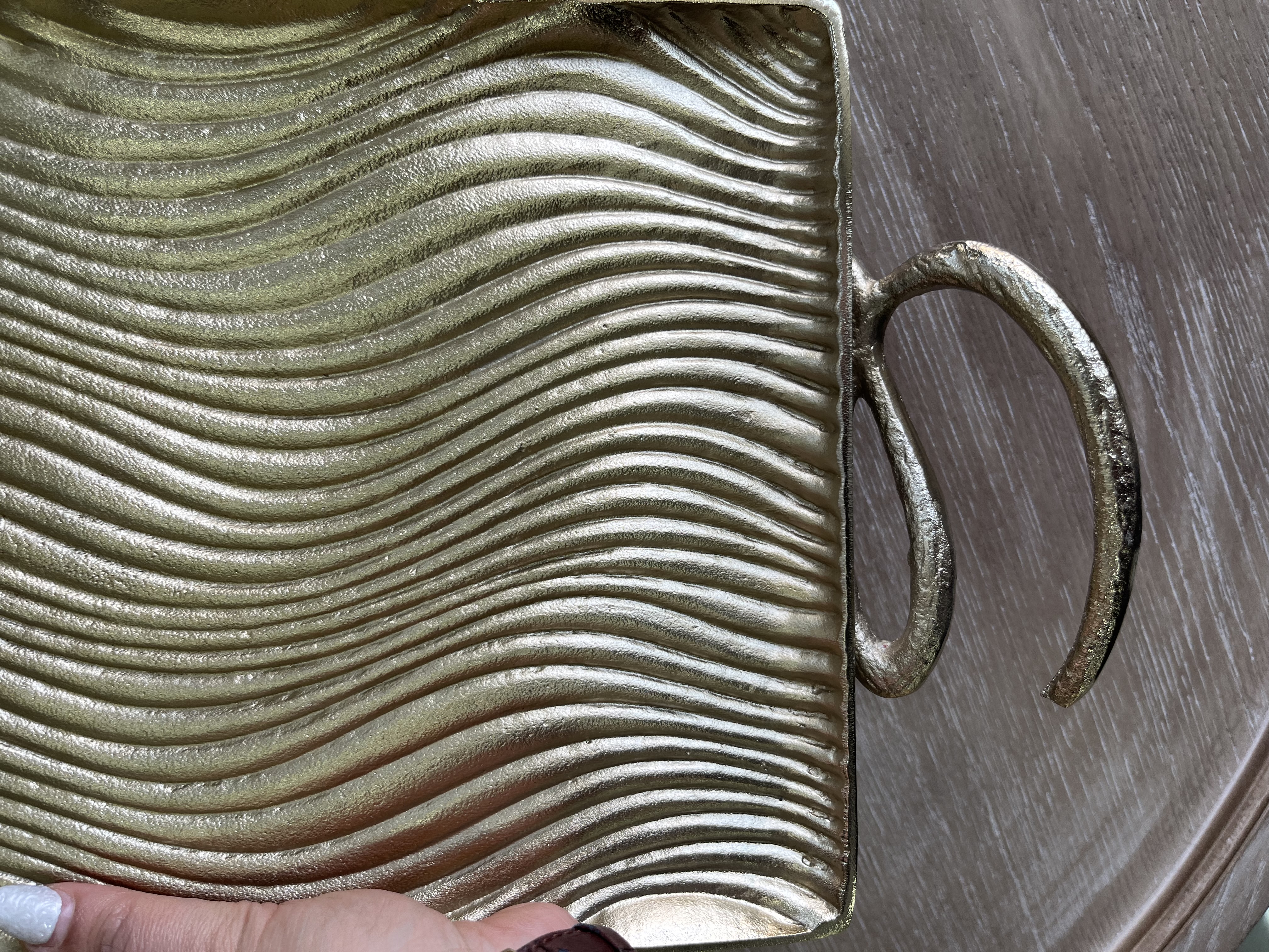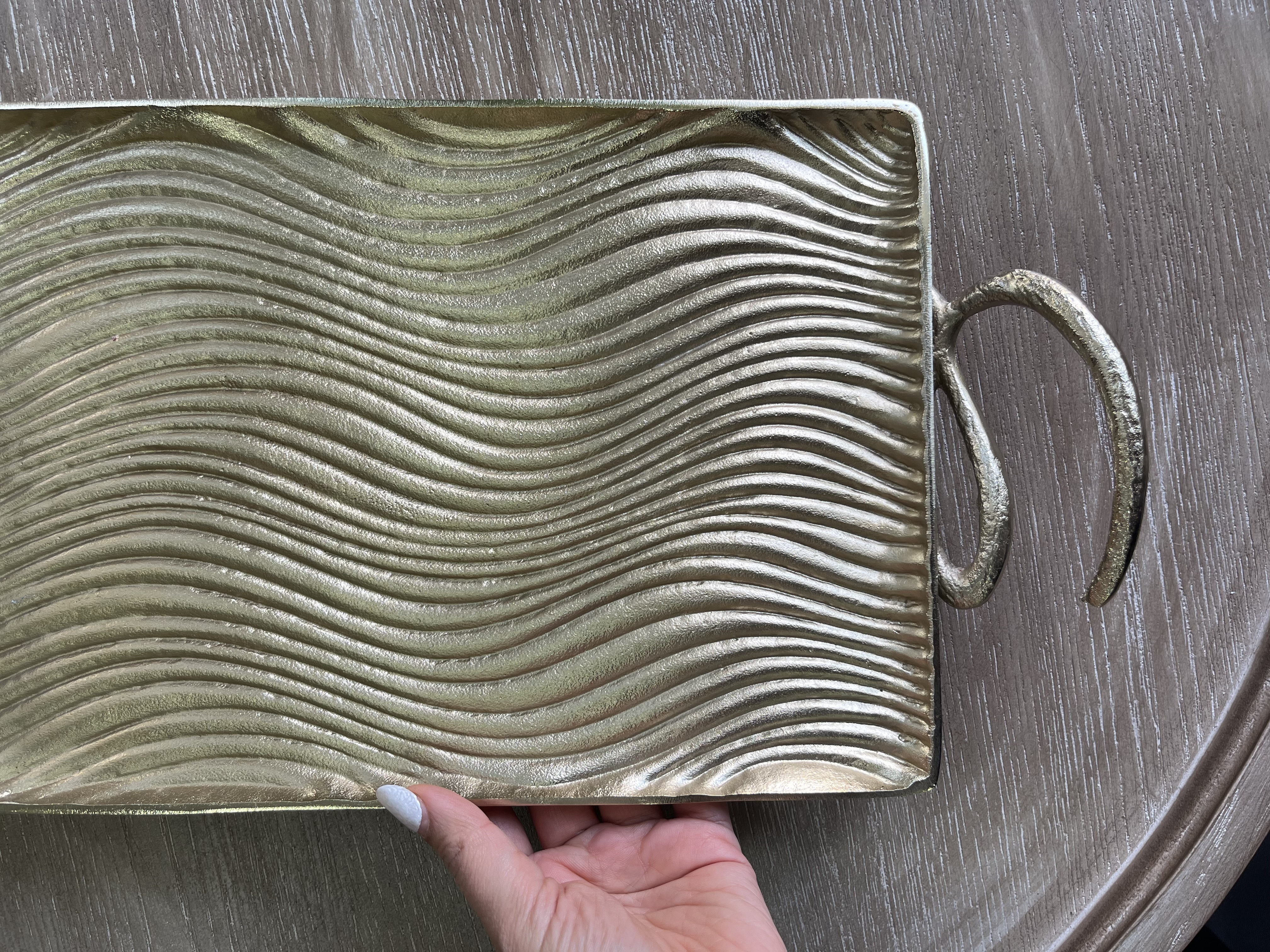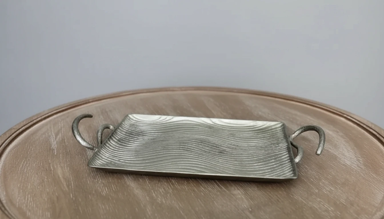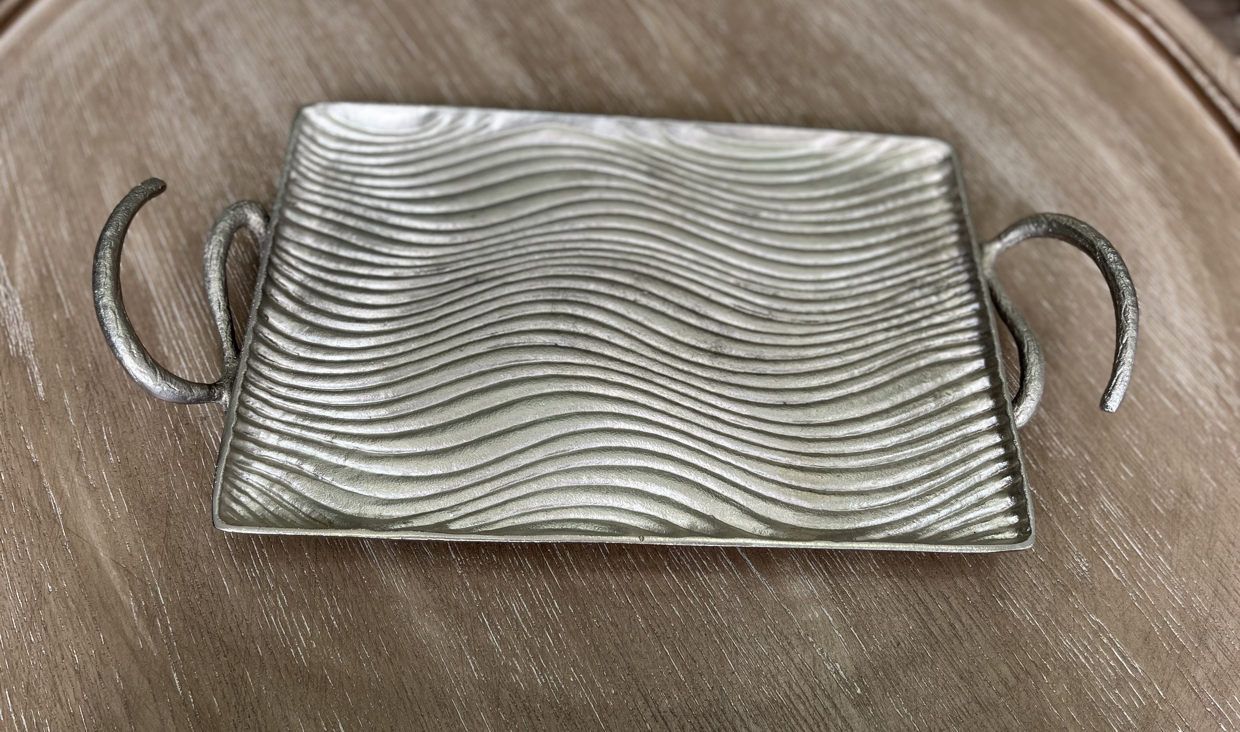 سينى فلزى مستطيلى طرح موج باطراحى خاص و مدرن، انتخابى عالى براى پذيرايي و دكوراسيون منزل است. سطح اين سينى با الكوى موجى برجسته طراحى شده كه علاوه برزيبايي، از سر خوردن ظروف نيز جلوكيرى مى كند. دسته هاى فلزى خميده دردو طرف سينى حمل آن را آسان كرده وظاهر دكورى آن را كامل تر مى كند.