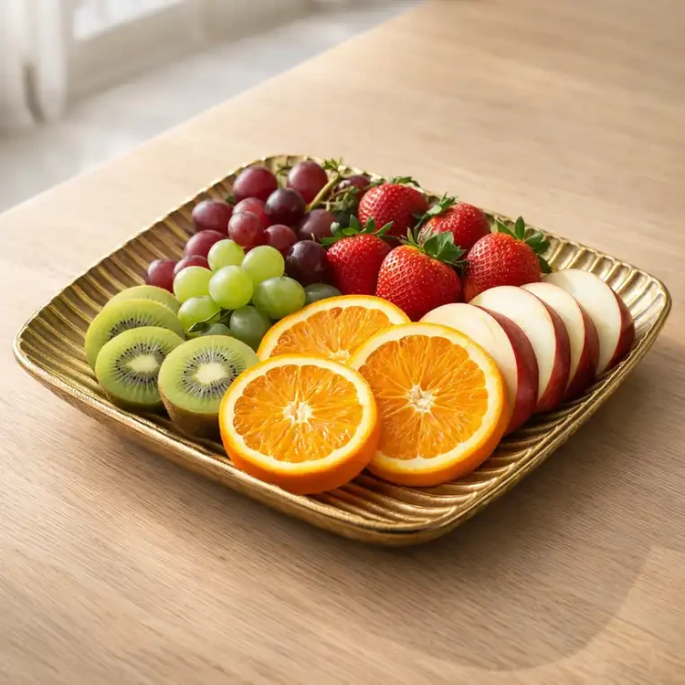 فرم مربعی آن باعث میشود فضای مناسبی برای قرار دادن میوه یا تنقلات فراهم شود و در عین حال روی میز نیز مرتبتر دیده شود. رنگ طلایی نیز یکی از رنگهای محبوب در دکوراسیون مدرن و لاکچری است که بهراحتی با ظروف سفید، مشکی یا سنگی ترکیب میشود.