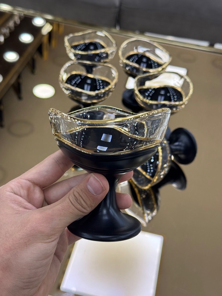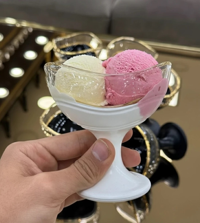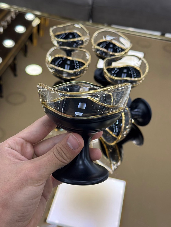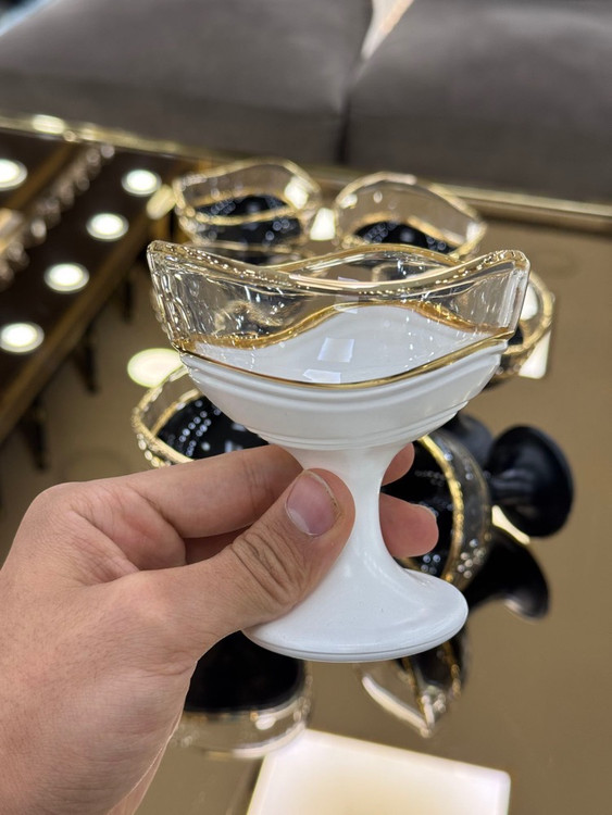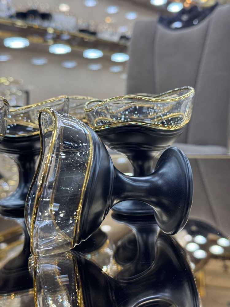 ترکیب این لبه طلایی با بدنه کریستالی مشکی و سفید جذابیتی چشمگیر ایجاد میکند؛ بهگونهای که این بستنی خوری را تبدیل به یک ظرف ساده نمیکند، بلکه آن را به یک قطعه تزئینی لاکچری تبدیل میکند که در هر ویترین، بوفه یا میز پذیرایی میدرخشد.